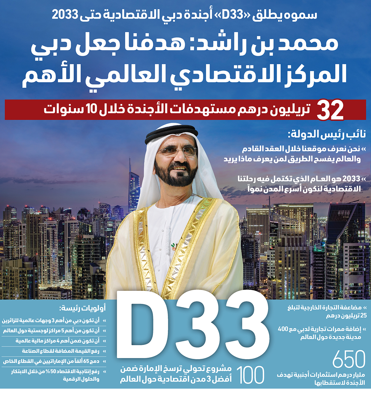 وقال صاحب السمو الشيخ محمد بن راشد آل مكتوم: «الإخوة والأخوات.. جرياً على عادتنا السنوية في الرابع من يناير، بإطلاق مشاريع وبرامج تغير واقعنا للأفضل.. اعتمدنا اليوم (أمس)، بحمد الله، أجندة دبي الاقتصادية للعشر سنوات القادمة «D33».. هدفنا مضاعفة حجم اقتصاد دبي خلال العقد القادم، وأن نكون ضمن أفضل 3 مدن اقتصادية في العالم».