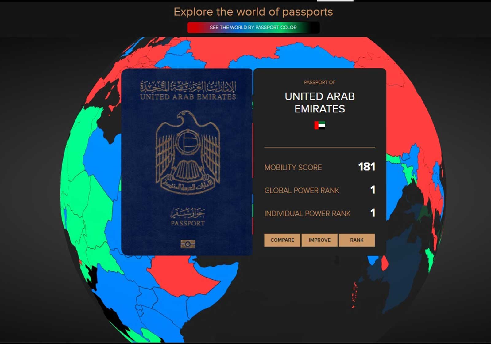 ووفقاً لآخر تحديث لمؤشر «باسبورت إندكس» التابع لشركة آرتون كابيتال للاستشارات المالية العالمية، يتربع الجواز الإماراتي حالياً على المرتبة الأولى عالمياً بدخول 91% من دول العالم بدون تأشيرة، إذ يسمح لحامله دخول 181 دولة حول العالم (122 دولة بدون تأشيرة مسبقة و59 دولة يمكن الحصول عليها إلكترونياً أو عند الوصول)، ولم يتبق أمامه إلا 17 دولة فقط تحتاج إلى تأشيرة مسبقة لدخول أراضيها.