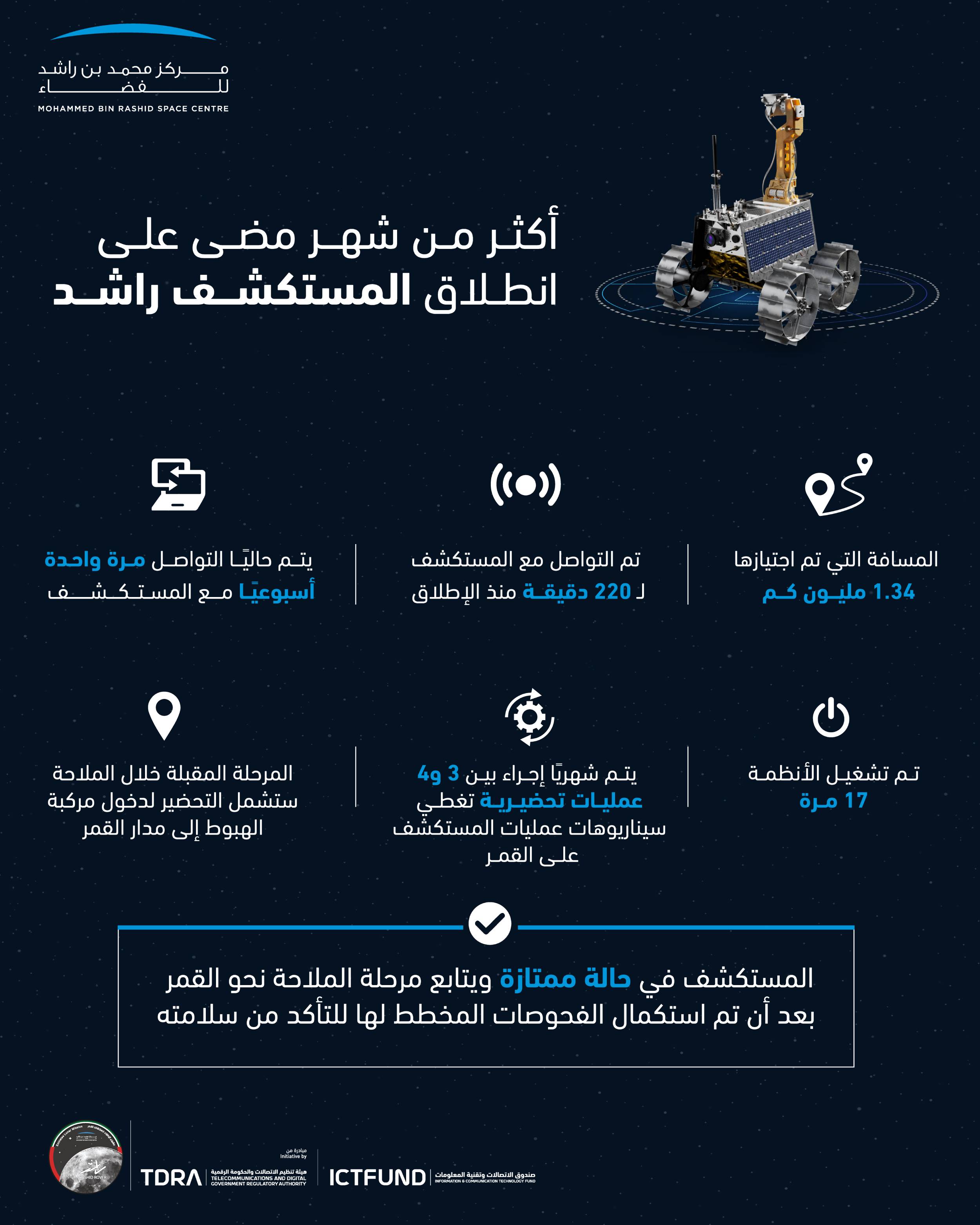 أعلن مركز محمد بن راشد للفضاء أن "المستكشف راشد" أكمل بنجاح شهرًا واحدًا في الفضاء، ضمن أول مهمة عربية لاستكشاف القمر، حيث قطع مسافة بلغت 1.34 مليون كيلومتر، منذ إطلاقه في 11 ديسمبر الماضي من المجمع رقم 40 في قاعدة كيب كانافيرال الفضائية في الولايات المتحدة الأمريكية.