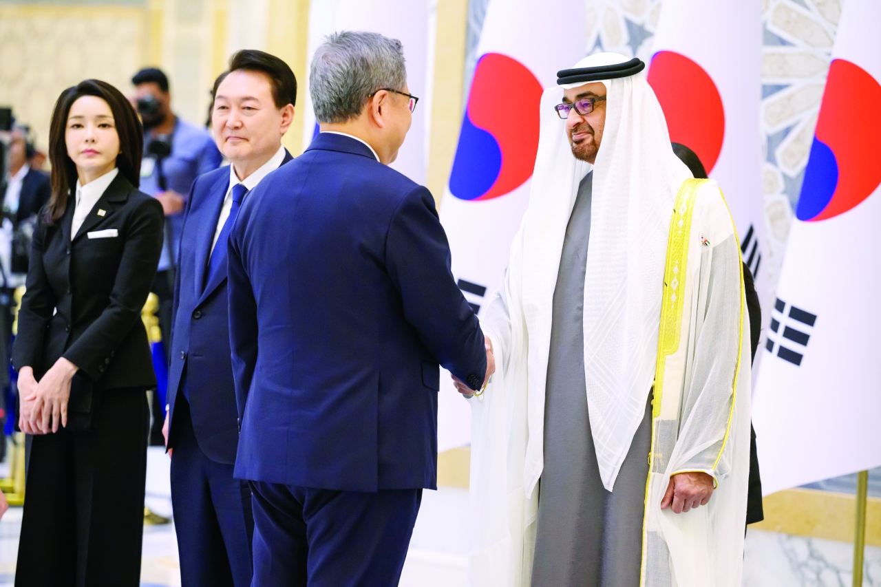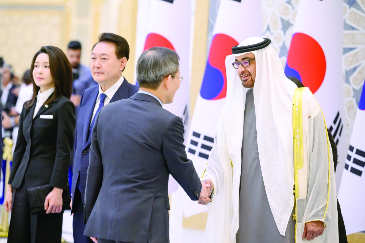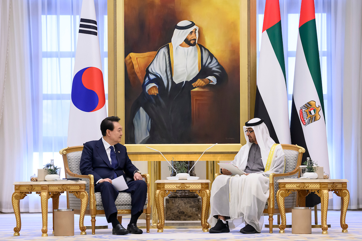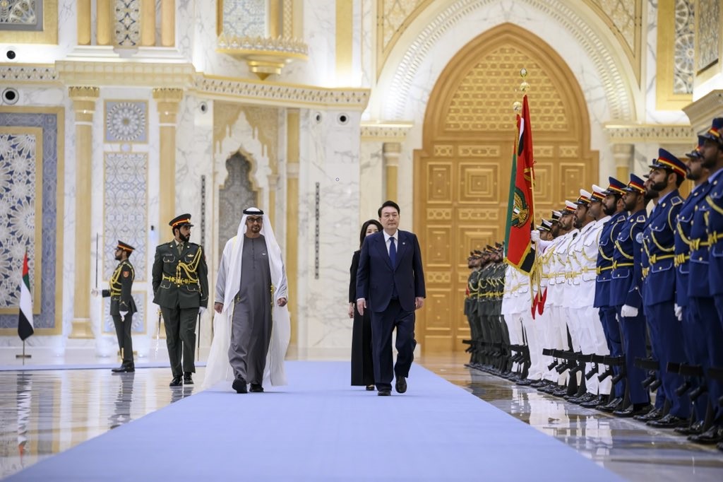 رحب صاحب السمو الشيخ محمد بن زايد آل نهيان، رئيس الدولة، حفظه الله، بفخامة الرئيس الكوري الجنوبي يون سيوك يول في الإمارات.