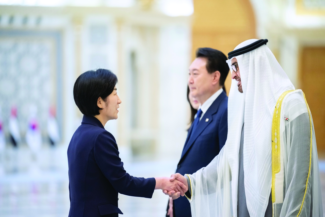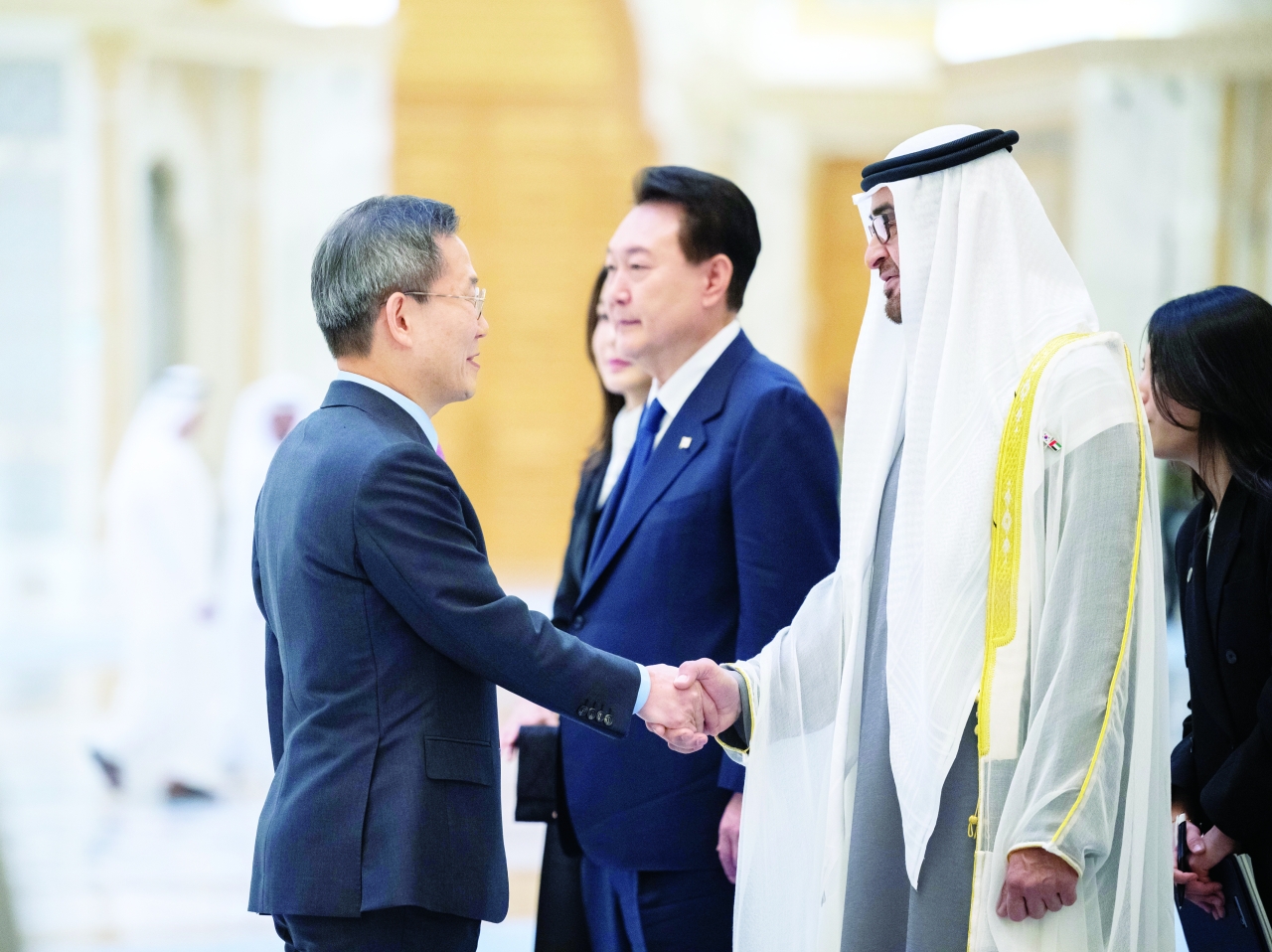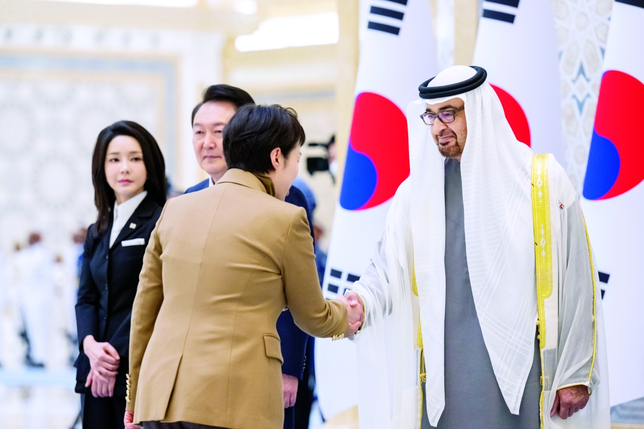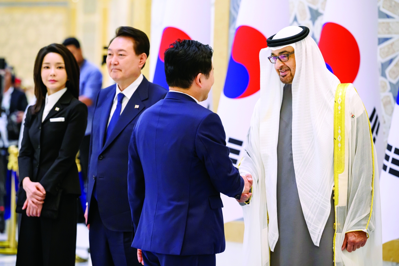 رحب صاحب السمو الشيخ محمد بن زايد آل نهيان، رئيس الدولة، حفظه الله، بفخامة الرئيس الكوري الجنوبي يون سيوك يول في الإمارات.