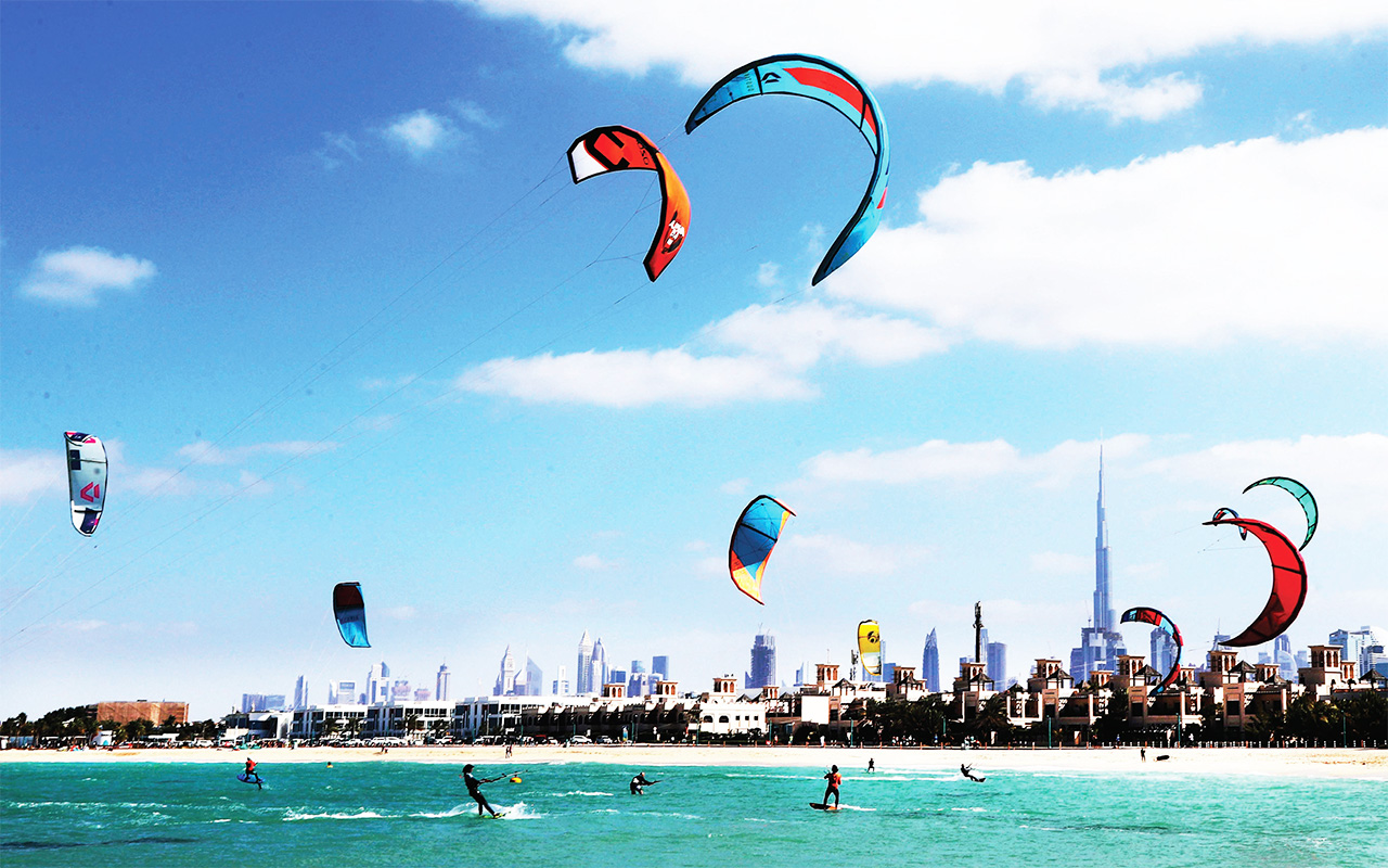 وتعد رياضة التزلج الشراعي والإبحار بالمظلة من أكثر الرياضات إقبالاً على شاطئ «كايت بيتش»، الذي يوفر العديد من النوادي والمرافق، التي تتيح التسجيل في الحصص التدريبية واستئجار المعدات الخاصة بهذه الرياضة، التي لا تحتاج إلى أي خبرة سابقة، إذ يتم جر مظلتك بقارب، وقد تصل إلى ارتفاع 150 متراً، حيث يمكنك تأمل أروع مناظر دبي من السماء.