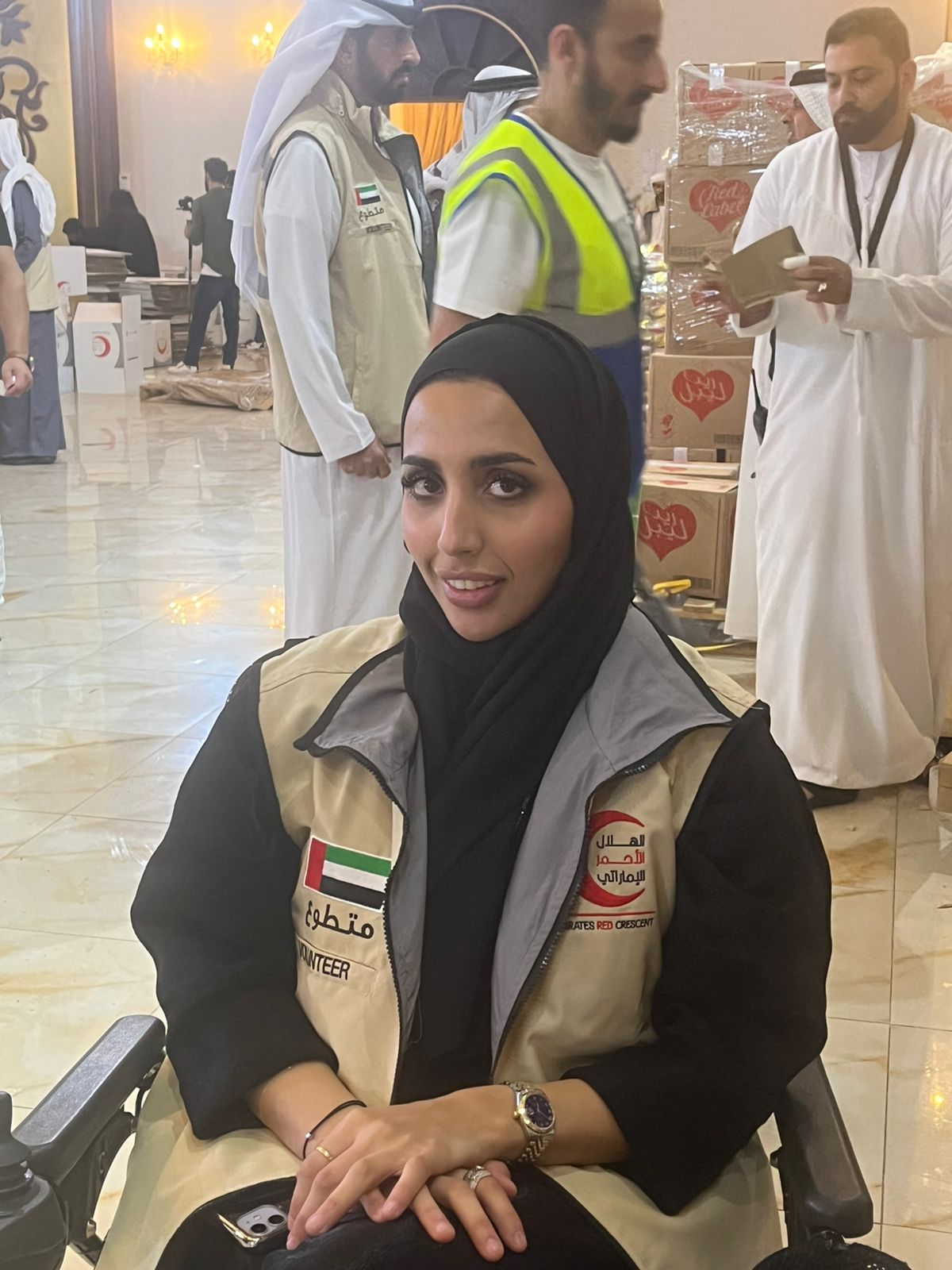على الرغم من إعاقتها الحركية، وعدم قدرتها على التنقل من مكان إلى آخر، إلا بواسطة كرسي متحرك، فقد حرصت مريم القبيسي على المشاركة في حملة "جسور الخير"، لتؤكد للعالم أن إعاقتها ليس عائقاً أمام خدمة وطنها، ودعم مبادرات قيادتنا الرشيدة في مد يد العون للمحتاجين خاصة المتضررين من الزلازل في سوريا وتركيا.