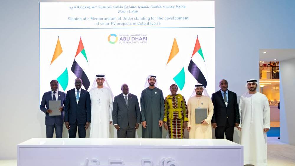 شهد معالي تيموكو ميلييت كوني، نائب رئيس جمهورية ساحل العاج، ومعالي الدكتور سلطان بن أحمد الجابر، وزير الصناعة والتكنولوجيا المتقدمة الرئيس المعين لمؤتمر COP28 رئيس مجلس إدارة شركة أبوظبي لطاقة المستقبل "مصدر"، ومعالي الشيخ شخبوط بن نهيان آل نهيان، وزير دولة، توقيع اتفاقية بين "مصدر" و وزارة المناجم والبترول والطاقة في جمهورية ساحل العاج، لاستكشاف سبل تطوير محطة طاقة شمسية بقدرة إنتاجية تصل إلى 70 ميجاواط.