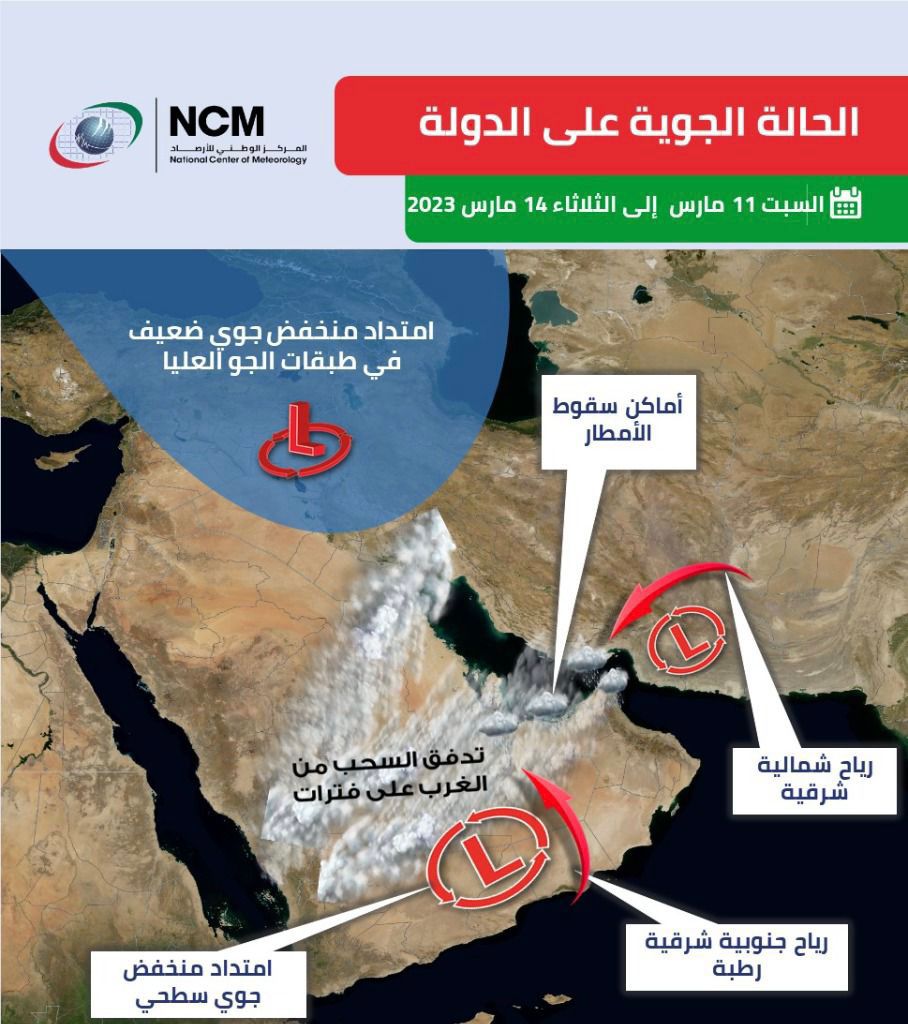 ووفق المركز الوطني للأرصاد يكون الطقس غائما جزئيا إلى غائم مع فرصة سقوط أمطار خفيفة إلى متوسطة على مناطق متفرقة وعلى فترات، تبدأ غرباً ثم تمتد على بعض المناطق الساحلية والشمالية والشرقية من الدولة مع فرصة تطور بعض السحب الركامية الممطرة شرقاً خاصة يومي السبت والأحد.