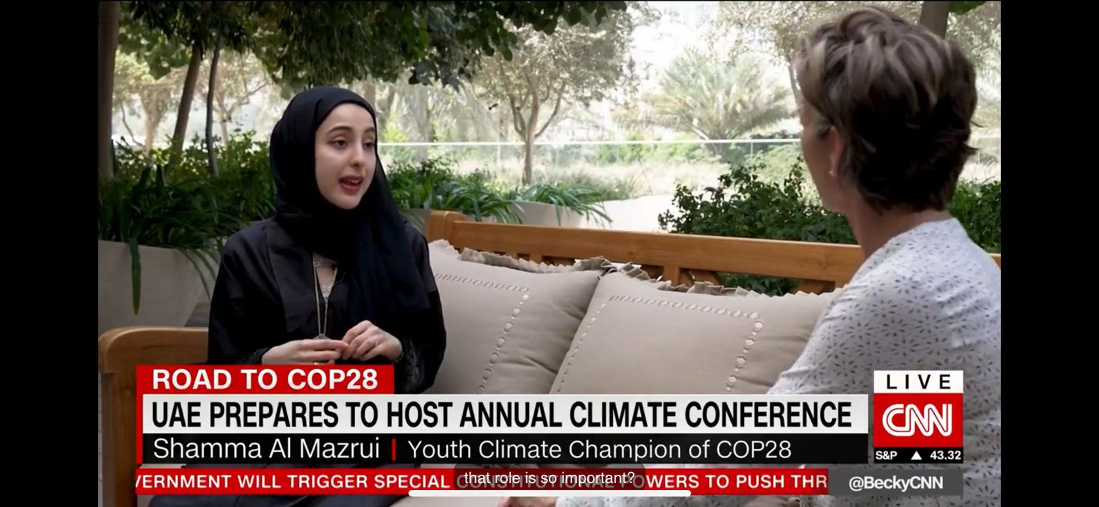 جاء ذلك في لقاء لمعاليها، مع قناة "سي إن إن" الدولية، على هامش فعالية "الطريق إلى COP28" التي أقيمت في مدينة إكسبو دبي في 15 مارس 2023، بحضور الشيخ زايد بن حمدان بن زايد آل نهيان، رئيس مجلس إدارة مجلس الإمارات للإعلام، والشيخ زايد بن سلطان بن خليفة آل نهيان، رئيس مجلس أمناء مؤسسة الشيخ سلطان بن خليفة آل نهيان الإنسانية والعلمية، ومعالي الدكتور سلطان أحمد الجابر وزير الصناعة والتكنولوجيا المتقدمة والرئيس المعيّن لمؤتمر الأطراف COP28، ومعالي سهيل المزروعي، وزير الطاقة والبنية التحتية، ومعالي مريم المهيري وزيرة التغير المناخي والبيئة، ورزان المبارك، رائدة المناخ لمؤتمر الأطراف COP28 إلى جانب عدد من المسؤولين.