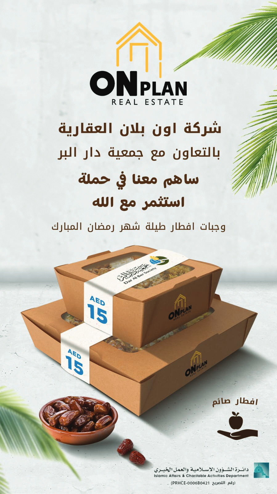 بالتعاون مع جمعية «دار البر».. أطلقت شركة «أون بلان» العقارية والتي تتخذ من دبي مقراً لها، مبادرة «افطر صائم واستثمر مع الله» لتقديم وجبات إفطار طيلة شهر رمضان المبارك.