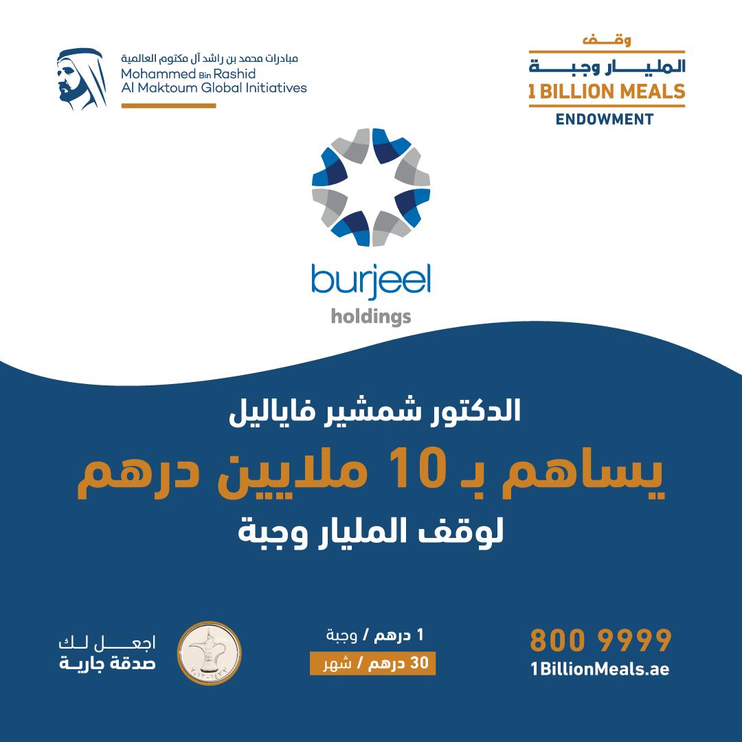 أعلن الدكتور شمشير فاياليل المؤسس ورئيس مجلس إدارة برجيل القابضة، عن مساهمته بـ 10 ملايين درهم دعماً لحملة "وقف المليار وجبة"، التي تدشن أكبر صندوق وقفي لإطعام الطعام في رمضان من أجل مساعدة الفئات الأقل حظاً في العالم بشكل مستدام.