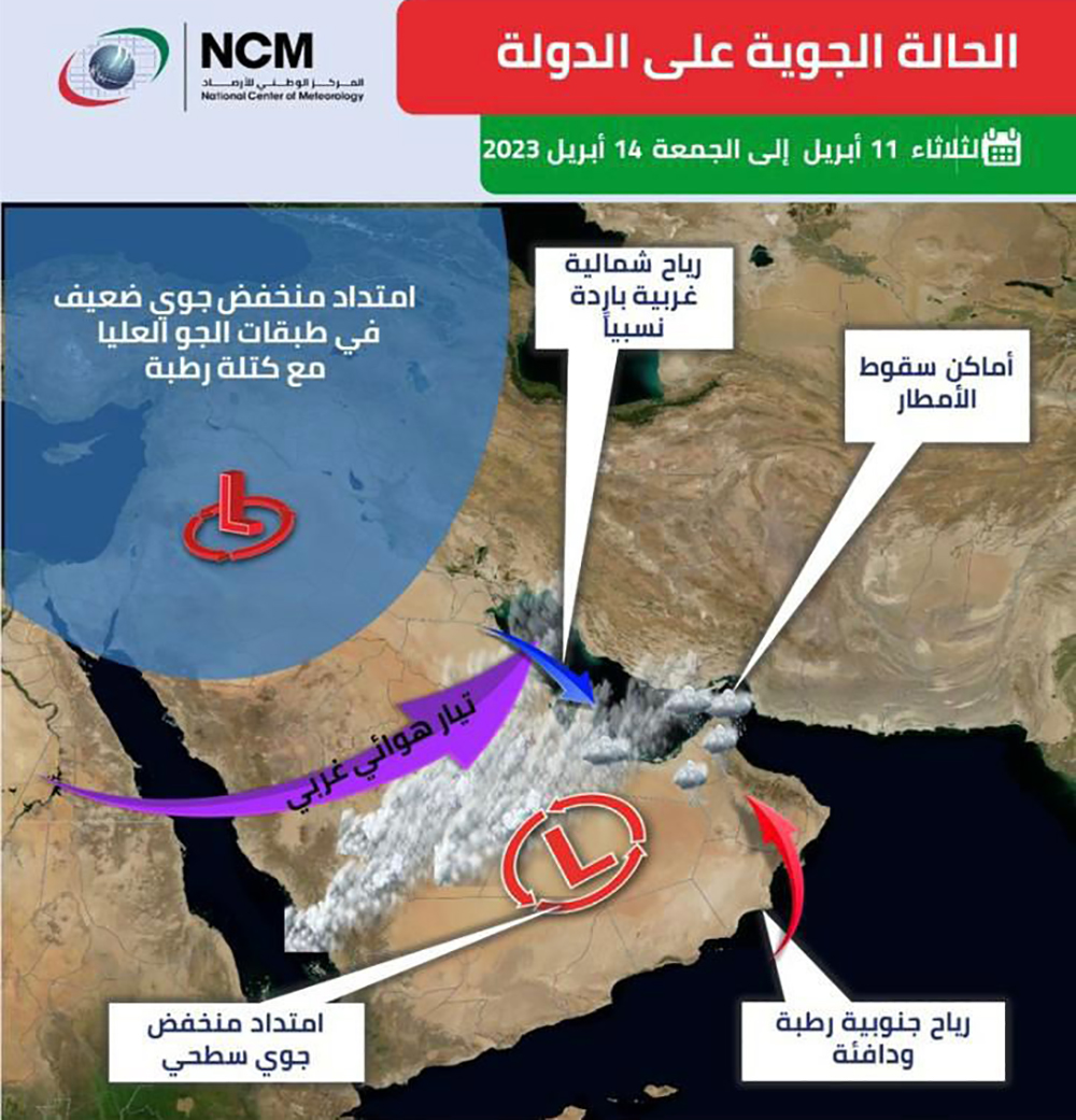 يتوقع المركز الوطني للأرصاد أن تتأثر الدولة بامتداد منخفض جوي سطحي من الجنوب الغربي مع امتداد منخفض جوي ضعيف في طبقات الجو العليا من الغرب وتيار هوائي غربي يصاحبه تشكيلات من السحب تتحرك من الغرب إلى الشرق مع سقوط أمطار على فترات ونتيجة لوجود الجبال شرقاً وارتفاع في درجات الحرارة السطح تتكون بعض السحب الركامية المحلية الممطرة .