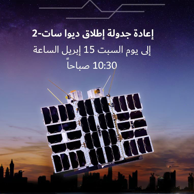 أعلنت هيئة كهرباء ومياه دبي إعادة جدولة إطلاق القمر الاصطناعي النانوي (ديوا سات-2) مرة أخرى إلى يوم السبت، 15 إبريل 2023 الساعة 10:30 صباحاً، وذلك بسبب الظروف الجوية غير الملائمة.