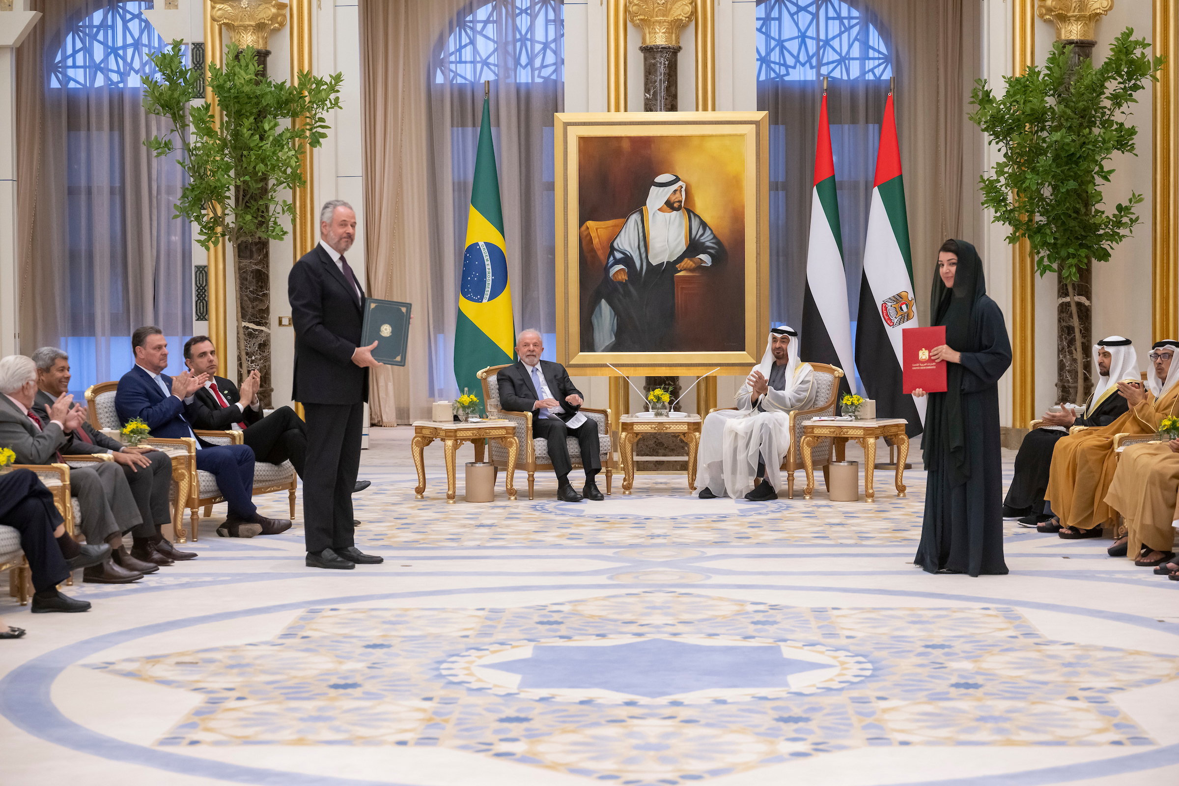 حضر اللقاء والمأدبة..سمو الشيخ منصور بن زايد آل نهيان نائب رئيس الدولة نائب رئيس مجلس الوزراء وزير ديوان الرئاسة وسمو الشيخ خالد بن محمد بن زايد آل نهيان ولي عهد أبوظبي وسمو الشيخ طحنون بن زايد آل نهيان نائب حاكم إمارة أبوظبي وسمو الشيخ حمدان بن زايد آل نهيان ممثل الحاكم في منطقة الظفرة ومعالي صقر غباش رئيس المجلس الوطني الاتحادي والفريق سمو الشيخ سيف بن زايد آل نهيان نائب رئيس مجلس الوزراء وزير الداخلية وسمو الشيخ عبدالله بن زايد آل نهيان وزير الخارجية والتعاون الدولي وسمو الشيخ حمدان بن محمد بن زايد آل نهيان ومعالي الشيخ محمد بن حمد بن طحنون آل نهيان مستشار الشؤون الخاصة في ديوان الرئاسة ومعالي علي بن حماد الشامسي الأمين العام للمجلس الأعلى للأمن الوطني ومعالي ريم بنت إبراهيم الهاشمي وزيرة دولة لشؤون التعاون الدولي ومعالي سهيل بن محمد فرج فارس المزروعي وزير الطاقة والبنية التحتية ومعالي عبد الله بن طوق المري وزير الاقتصاد ومعالي مريم بنت محمد المهيري وزيرة التغير المناخي والبيئة ومعالي الدكتور ثاني بن أحمد الزيودي وزير دولة للتجارة الخارجية ومعالي سارة بنت يوسف الأميري وزيرة دولة للتعليم العام والتكنولوجيا المتقدمة ومعالي نورة بنت محمد الكعبي وزيرة دولة ومعالي أحمد بن علي محمد الصايغ وزير دولة ومعالي خلدون خليفة المبارك رئيس جهاز الشؤون التنفيذية عضو المجلس التنفيذي وسعادة صالح أحمد السويدي سفير الدولة لدى البرازيل وعدد من المسؤولين.