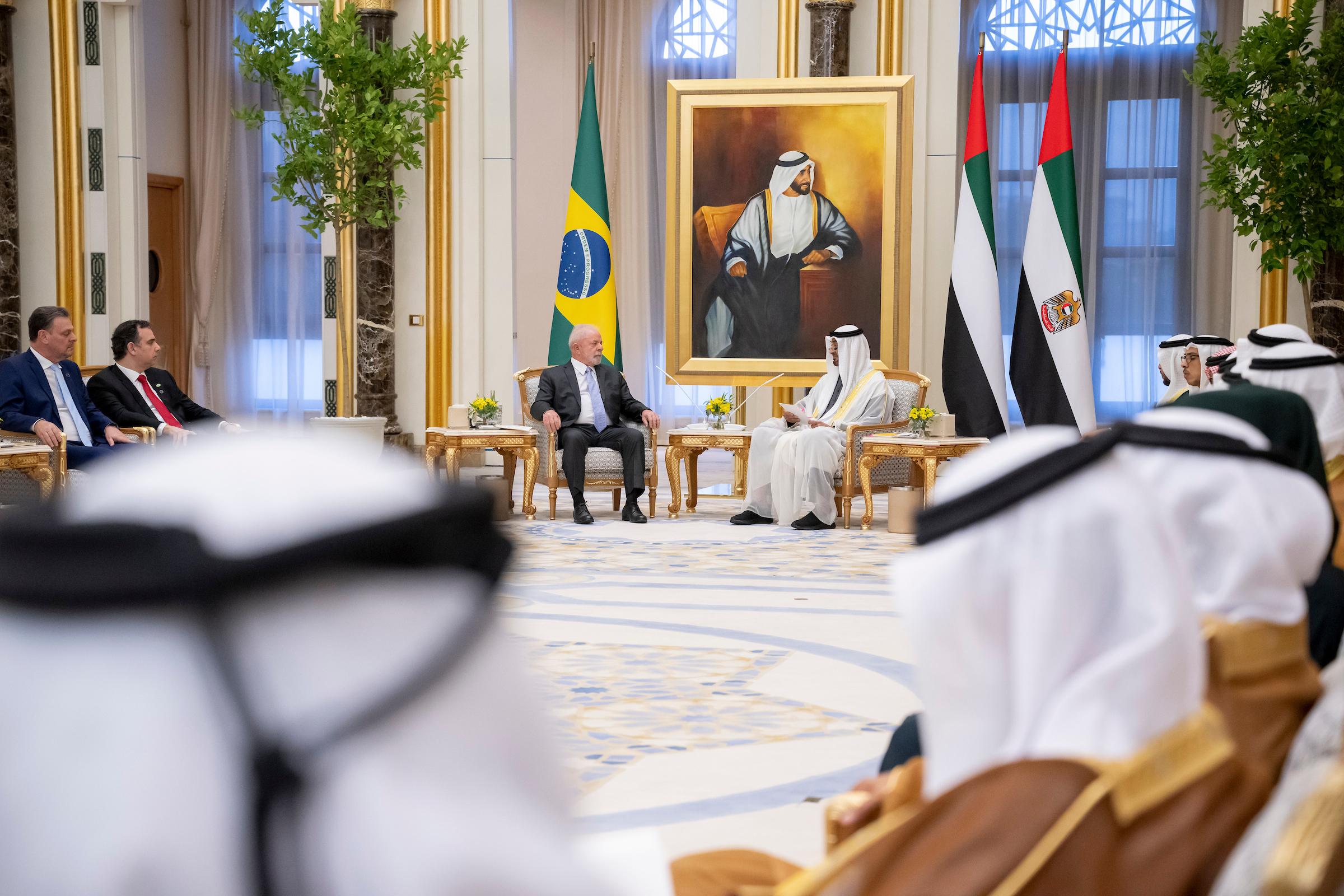 عقد صاحب السمو الشيخ محمد بن زايد آل نهيان رئيس الدولة "حفظه الله" وفخامة لويس ايناسيو لولا دا سيلفا رئيس جمهورية البرازيل الاتحادية الصديقة..جلسة محادثات رسمية تناولت مختلف جوانب العلاقات الثنائية وسبل تعزيزها في إطار الشراكة الاستراتيجية التي تجمع البلدين وحرصهما على الدفع بها إلى آفاق أرحب تخدم مصالحهما المتبادلة.