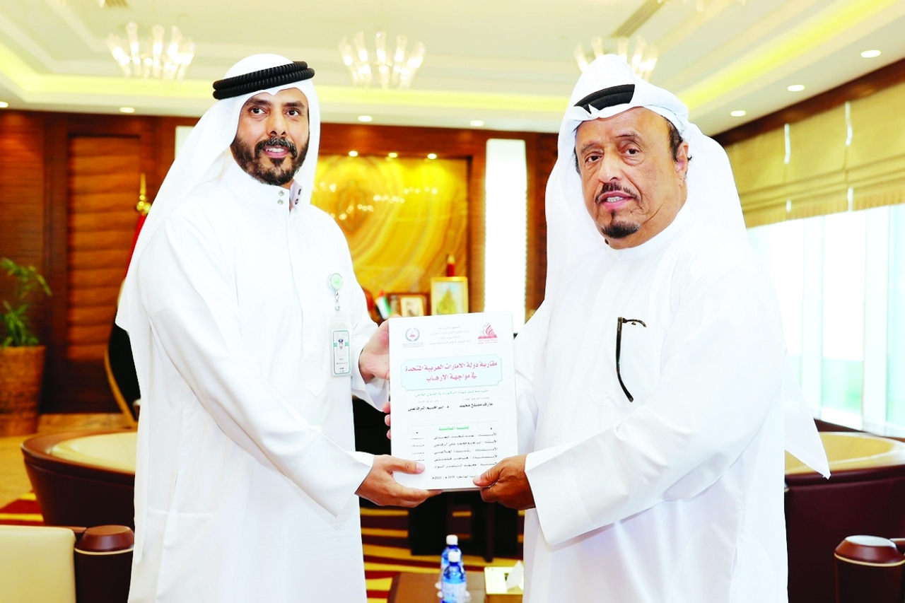 تلقى معالي الفريق ضاحي خلفان تميم، نائب رئيس الشرطة والأمن العام في دبي، نسخة من أطروحة دكتوراه بعنوان «مقاربة دولة الإمارات العربية المتحدة في مواجهة الإرهاب»، المقدمة من الملازم أول عارف مصلح فاضل، من الإدارة العامة للتحريات والمباحث الجنائية بشرطة دبي.