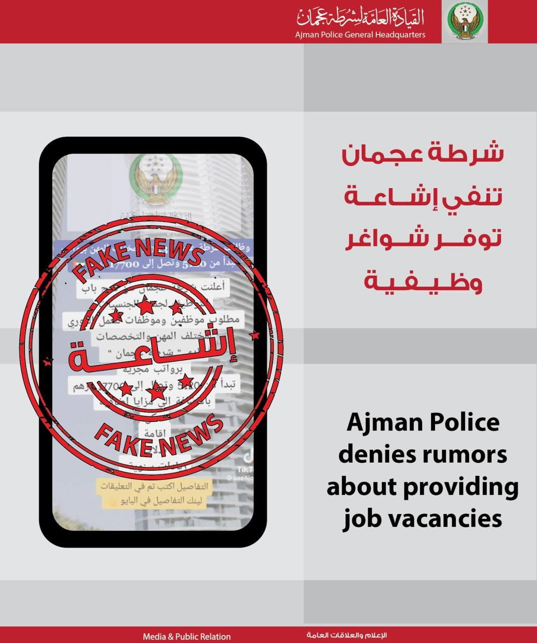 ودعت شرطة عجمان الجمهور إلى اعتماد الأخبار والإعلانات من مصادرها الرسمية، محذرةً من عواقب نشر الشائعات.