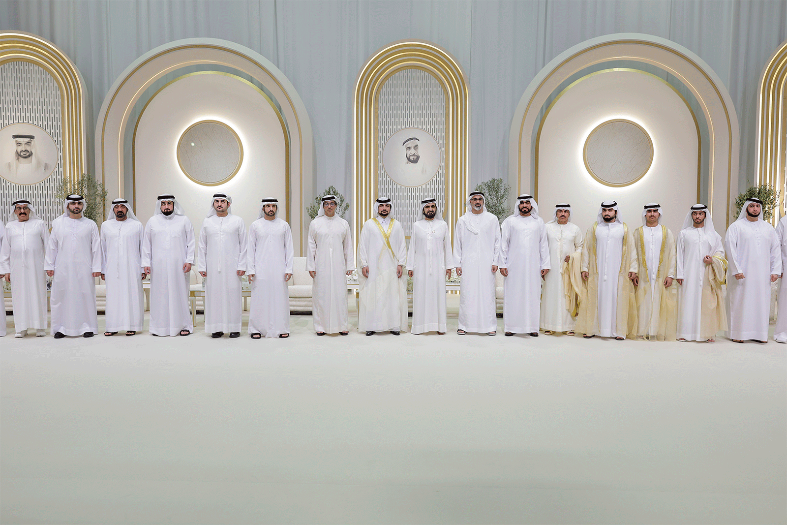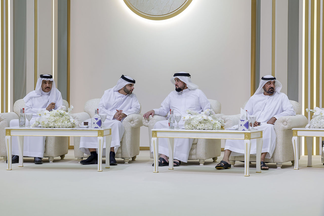 وسمو الشيخ أحمد بن محمد بن راشد آل مكتوم، النائب الثاني لحاكم دبي.. بمناسبة زفاف مانع نجل الشيخ محمد بن راشد بن مانع آل مكتوم إلى كريمة صاحب السمو الشيخ محمد بن راشد آل مكتوم، وذلك خلال حفل الاستقبال الذي أقيم اليوم السبت في قاعة زعبيل بمركز دبي التجاري العالمي.