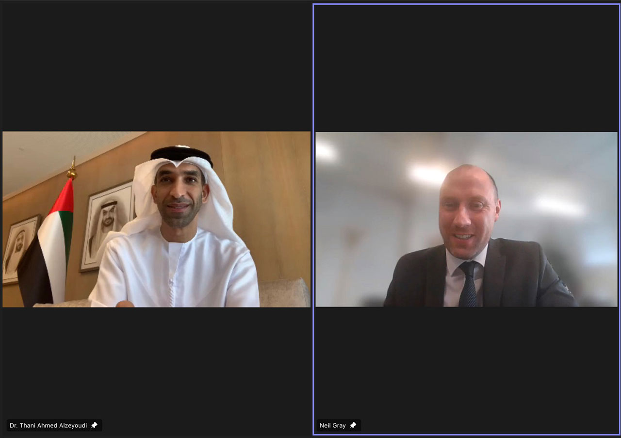 جاء ذلك خلال اللقاء الذي جمع الزيودي عبر تقنية الفيديو مع نيل جراي أمين عام مجلس وزراء أسكتلندا لاقتصاد الرفاهية والعمل العادل والطاقة، وذلك للوقوف على آخر مستجدات المشاريع المشتركة بين الجانبين، وبحث سبل توطيد التعاون في المجالات ذات الاهتمام المشترك، وخصوصاً في قطاعات الصناعات الغذائية والطاقة النظيفة والتكنولوجيا المتقدمة.