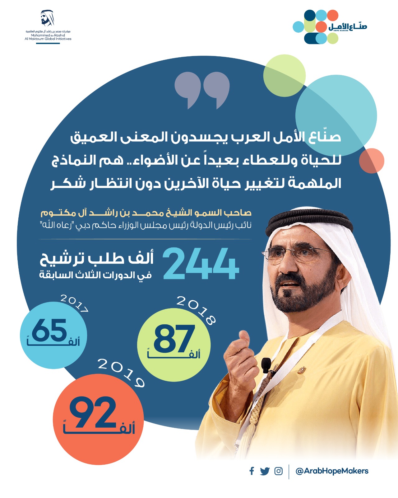 ولقي إعلان سموه تفاعلاً كبيراً في الوطن العربي، حيث فاق عدد طلبات الترشيح من صناع أمل، أفراداً ومجموعات تطوعية ومؤسسات إنسانية ومجتمعية، 65 ألف طلب، من مختلف أنحاء الوطن العربي، وهو رقم فاق التوقعات، علماً بأن الرقم المستهدف للمبادرة كان 20 ألفاً.