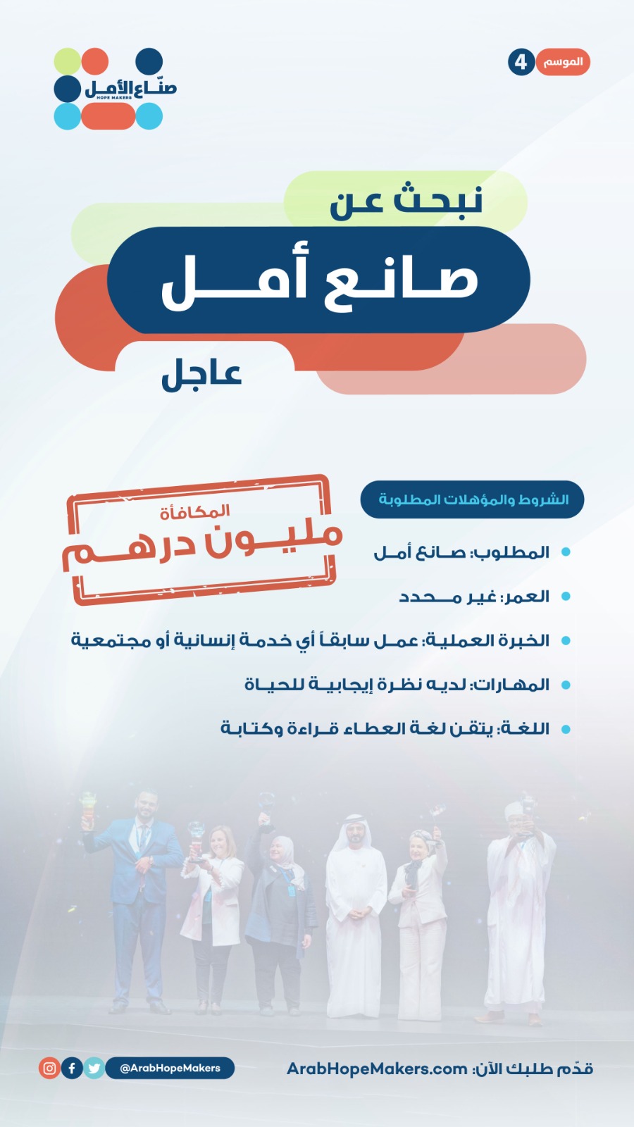 وتبدأ الدورة الرابعة من مبادرة "صناع الأمل" في تلقي طلبات عبر موقعها الإلكتروني arabhopemakers.com، حيث تسعى المبادرة إلى جمع عشرات الآلاف من قصص الأمل في الوطن العربي من خلال تقصي قصصهم، وإلقاء الضوء على صنّاع هذه الآمال وأصحاب المشاريع والبرامج النبيلة، ورصد جهودهم والاحتفاء بها.
