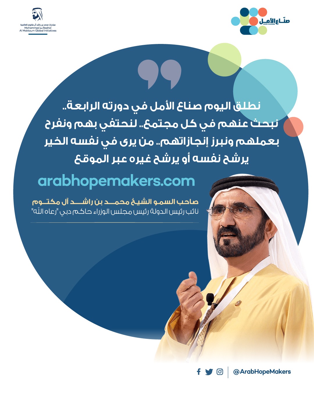 وأضاف سموه: "نطلق اليوم صناع الأمل في دورته الرابعة.. نبحث عنهم في كل مجتمع.. لنحتفي بهم ونفرح بعملهم ونبرز إنجازاتهم.. من يرى في نفسه الخير يرشح نفسه أو يرشح غيره عبر الموقع arabhopemakers.com".