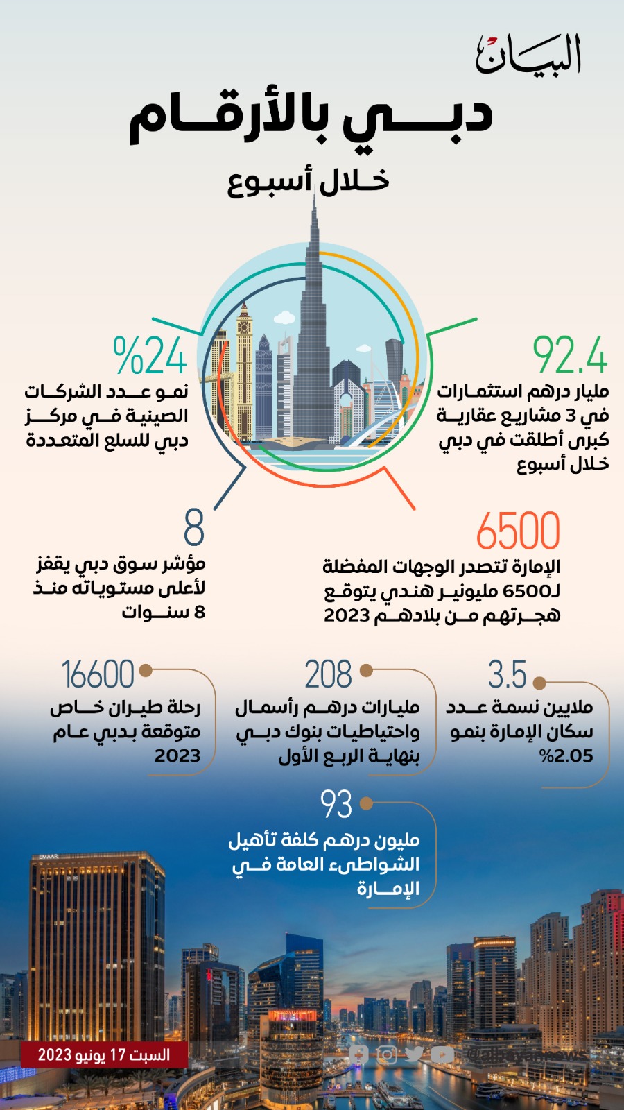 العديد من الأرقام المتميزة حققتها دبي خلال 7 أيام، محققة نمو في مختلف المجالات الاقتصادية والسياحية، أو على مستوى البنى التحتية وحتى على مستوى النمو السكاني.