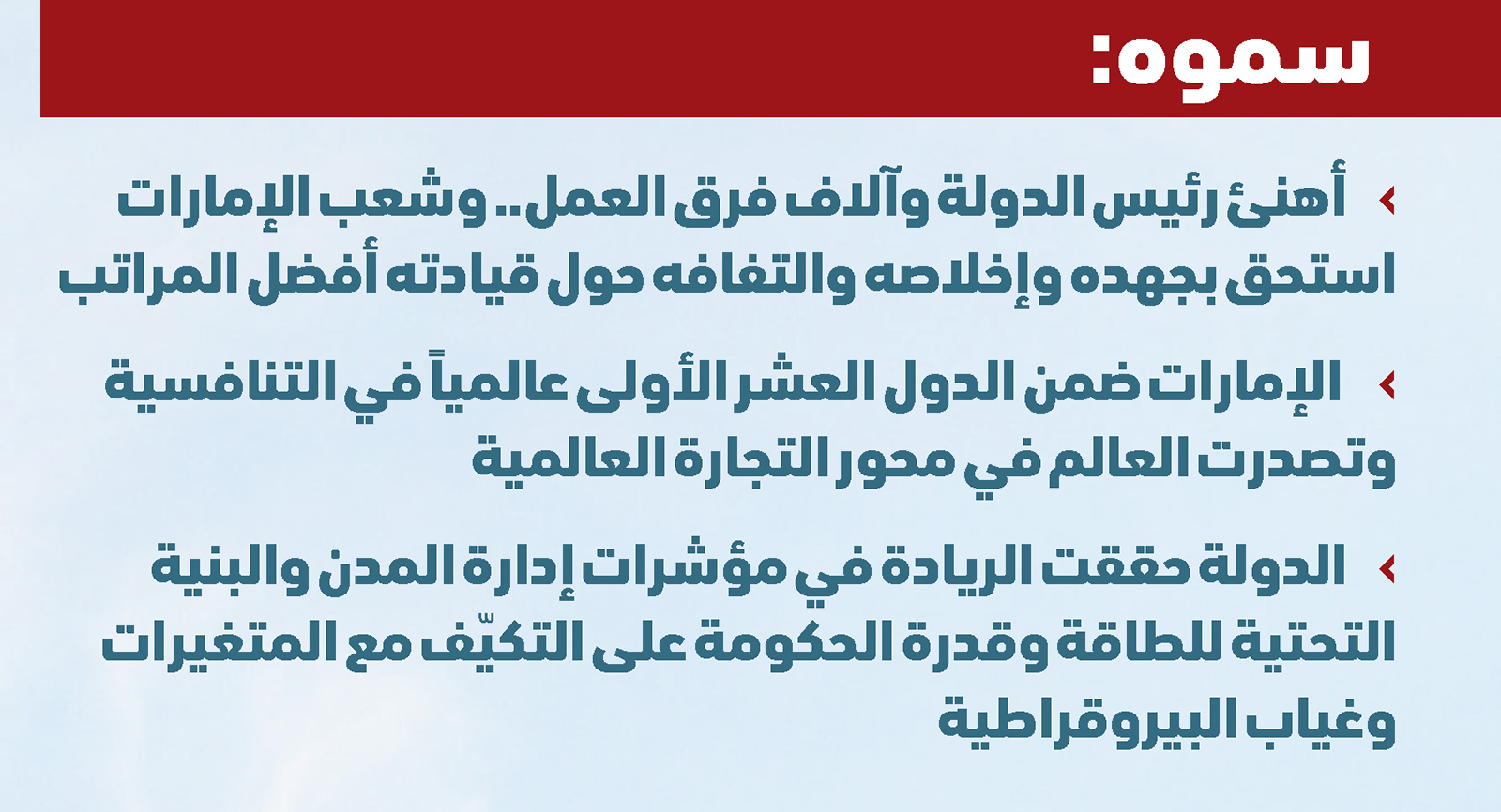 وجاءت دولة الإمارات ضمن الدول العشر الأولى عالمياً في مجال التنافسية متصدرة العالم في محور التجارة العالمية وفي عدة مؤشرات مثل إدارة المدن والبنية التحتية للطاقة وقدرة الحكومة على التكيف مع المتغيرات وغياب البيروقراطية وغيرها.. كما جاء أداؤها الاقتصادي المتميز ليضعها في المرتبة الرابعة عالمياً».