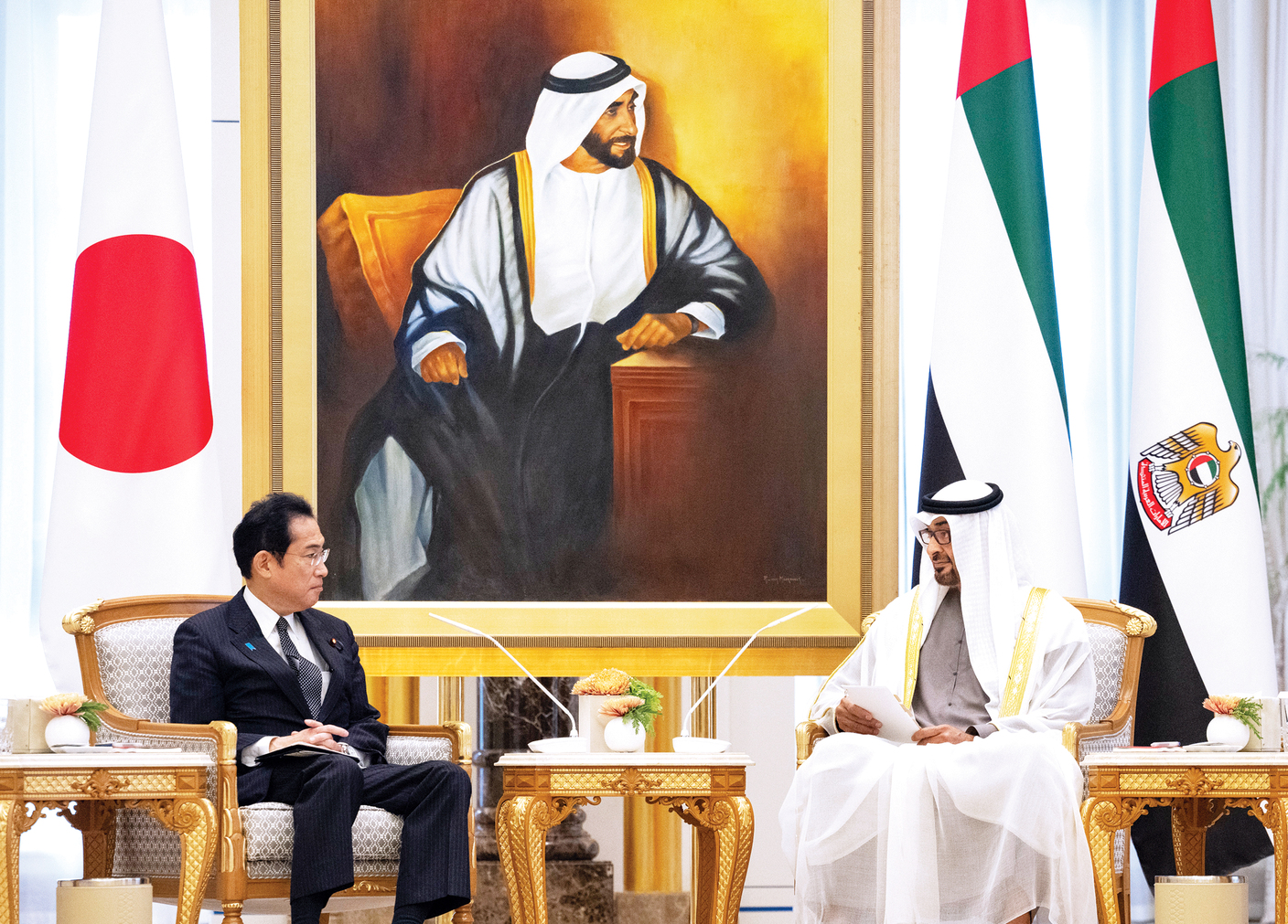 بحث صاحب السمو الشيخ محمد بن زايد آل نهيان، رئيس الدولة، حفظه الله، وفوميو كيشيدا، رئيس وزراء اليابان الصديقة سبل تنمية علاقات التعاون وتطويره إلى آفاق أوسع في مختلف المجالات، وذلك في إطار العلاقات التاريخية الراسخة والشراكة الاستراتيجية الشاملة بين البلدين، إضافة إلى مجمل القضايا الإقليمية والدولية محل الاهتمام المشترك. جاء ذلك في جلسة المحادثات التي عقدها صاحب السمو رئيس الدولة، أمس في قصر الوطن، مع فوميو كيشيدا، الذي يقوم بزيارة رسمية لدولة الإمارات.