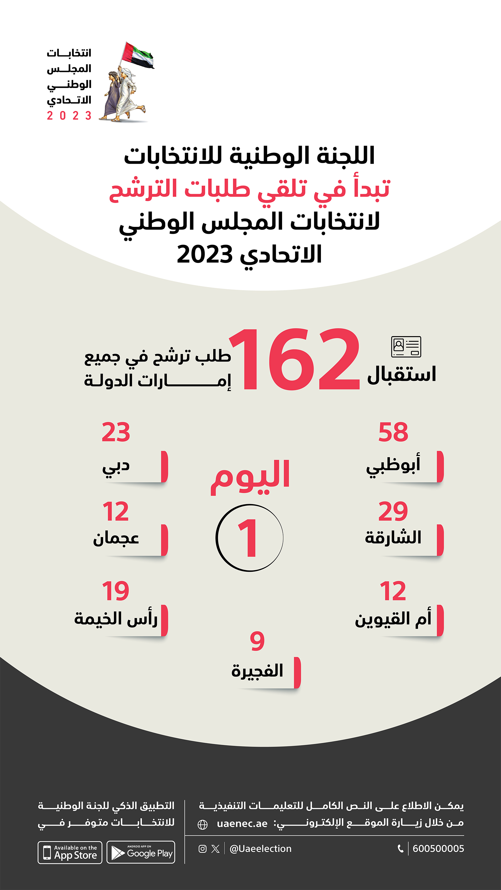 وبلغ عدد طلبات الترشح التي تلقتها اللجنة خلال اليوم الأول لتسجيل المرشحين 162 طلباً في جميع إمارات الدولة، حيث وصل عدد طلبات الترشح- خلال اليوم الأول- في إمارة أبوظبي 58 طلباً، وفي إمارة دبي 23 طلباً، وفي إمارة الشارقة 29 طلباً، وفي إمارة عجمان 12 طلباً، وفي إمارة أم القيوين 12 طلباً، وفي إمارة رأس الخيمة 19 طلباً، وفي إمارة الفجيرة 9 طلبات.