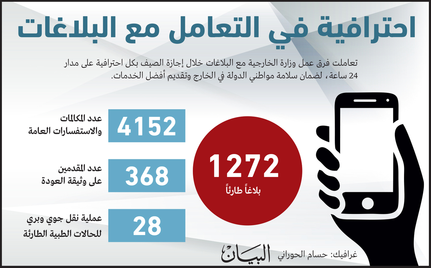 أعلنت وزارة الخارجية عن استقبالها أكثر من 4152 مكالمة، منها 1272 حالة طارئة، عبر خط الطوارئ المخصص لمواطني الدولة الموجودين في الخارج 0097180024 خلال إجازة صيف 2023.