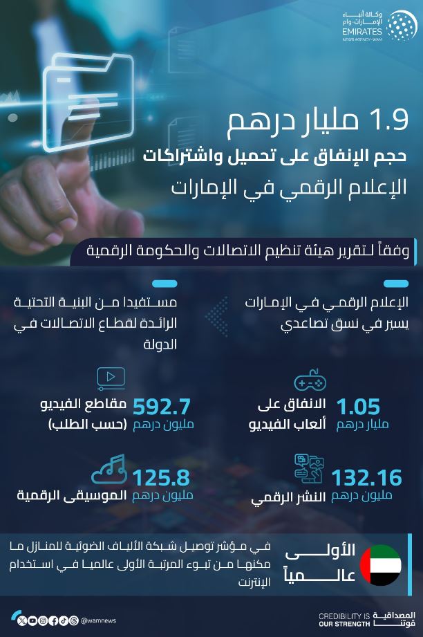 بلغ حجم الإنفاق على تحميل واشتراكات الإعلام الرقمي في دولة الإمارات، خلال العام الماضي، مليار و902 مليون درهم، وذلك بحسب تقرير “الإمارات الرقمية 2023: حقائق وأرقام”، الصادر عن هيئة تنظيم الاتصالات والحكومة الرقمية.