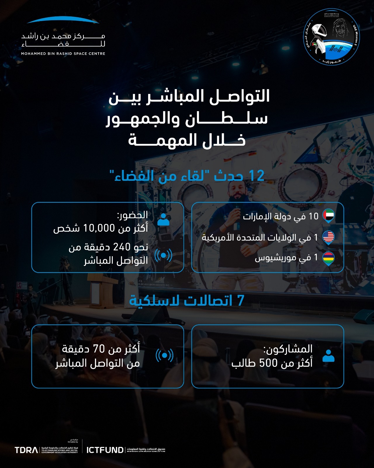 مع عودة رائد الفضاء الإماراتي سلطان النيادي من محطة الفضاء الدولية إلى الأرض، بعد أطول مهمة فضائية في تاريخ العرب تواصلت 6 أشهر، وخلال مدة الرحلة حضر أكثر من 10500 ما بين طلاب ومحبين للفضاء، سلسلة «لقاء من الفضاء» والتي شهدت اتصالات مرئية مباشرة ولاسلكية مع رائد الفضاء سلطان النيادي من محطة الفضاء الدولية.