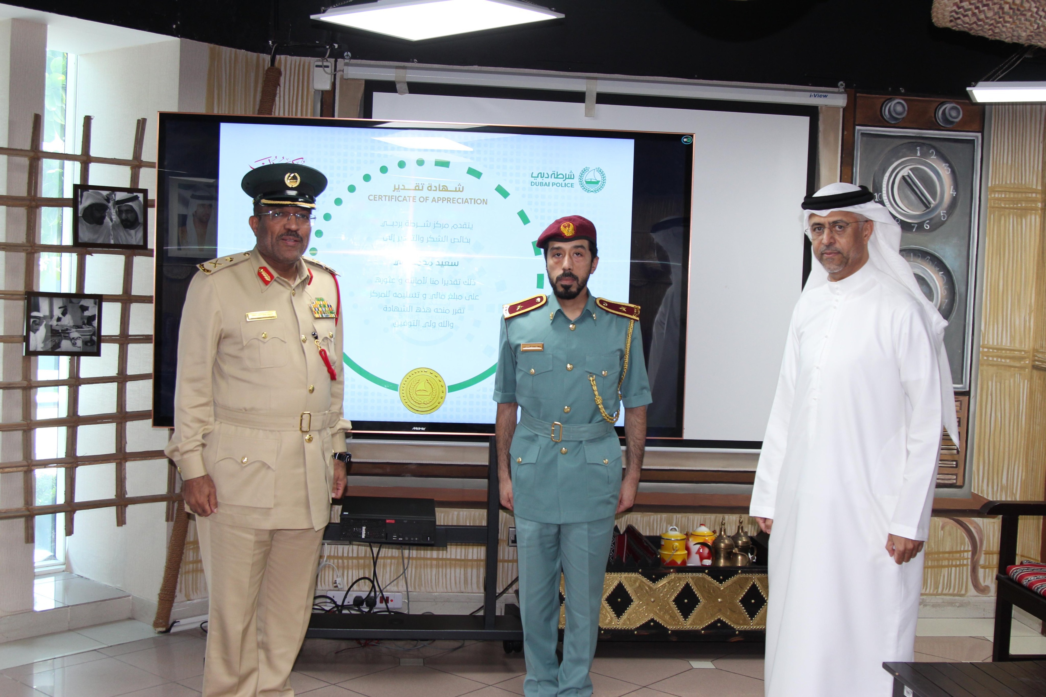 كرم سعادة اللواء عبد الله خادم سرور المعصم، مدير مركز شرطة بردبي، الملازم سعيد محمد علي، الذي يعمل في الإدارة العامة للدفاع المدني، تقديراً لأمانته وحرصه على تسليم مبلغ مالي عثر عليه في منطقة الاختصاص.