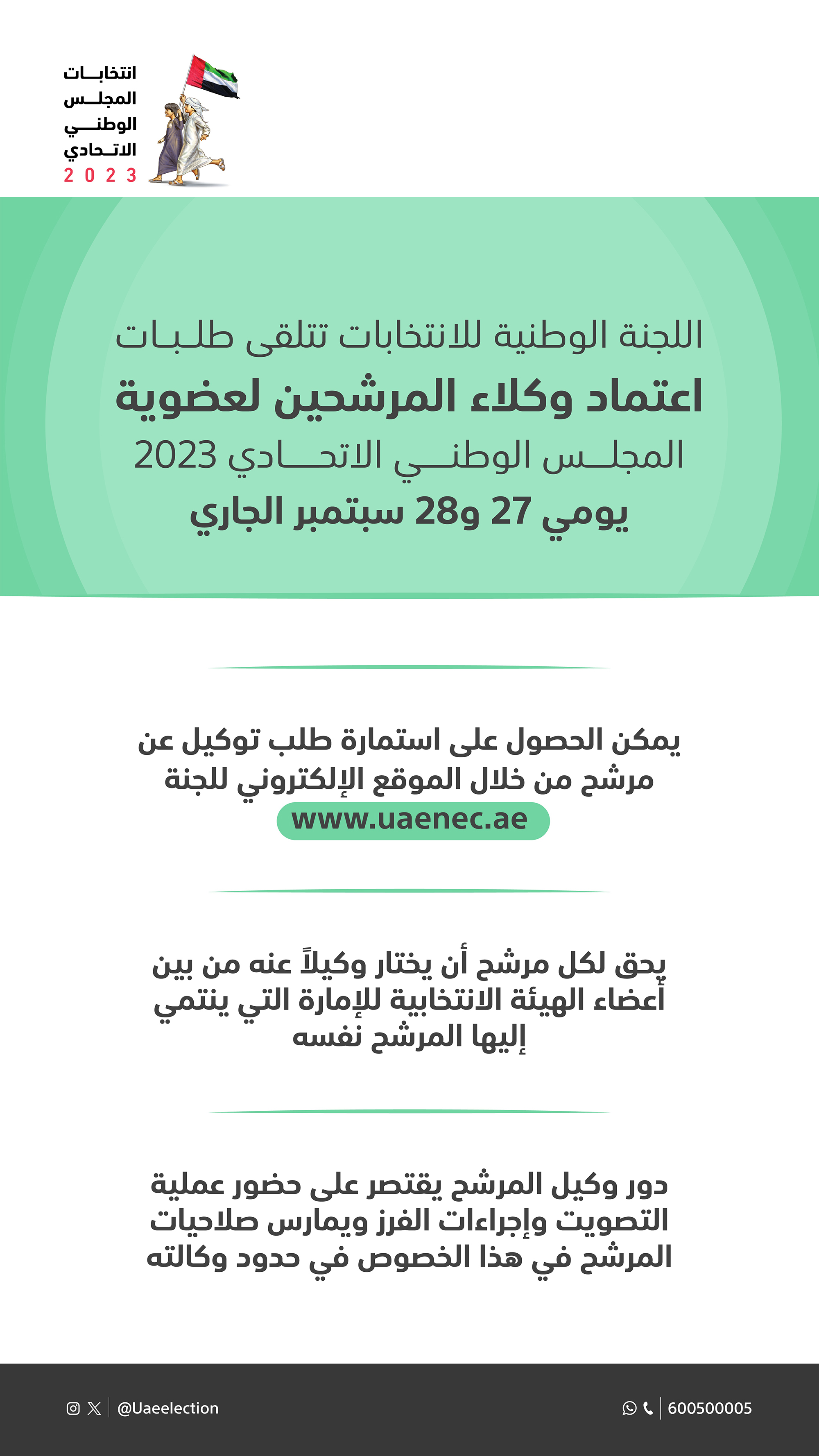 ولفتت اللجنة إلى ما تضمنته المادة (28) من التعليمات التنفيذية لانتخابات المجلس الوطني الاتحادي 2023 من منح كل مرشح الحق في اختيار وكيل عنه من بين أعضاء الهيئة الانتخابية للإمارة التي ينتمي إليها المرشح نفسه، على أن يتقدم المرشح بطلب إلى لجنة الإمارة وفق النموذج المعتمد لذلك خلال الفترة المحددة، ويتم اعتماد وكلاء المرشحين من قبل لجنة إدارة الانتخابات.