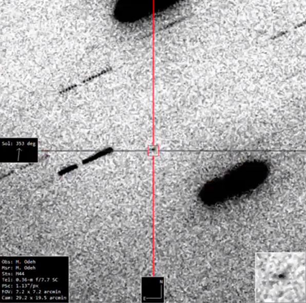 الصورة عبارة عن ثلاث إطارات متتابعة، والفاصل بين كل منها حوالي سبع دقائق، ويبدو المسبار كنقطة صغيرة في المنتصف تتحرك بين النجوم التي تبدو على هيئة خطوط بسبب طول التعريض.