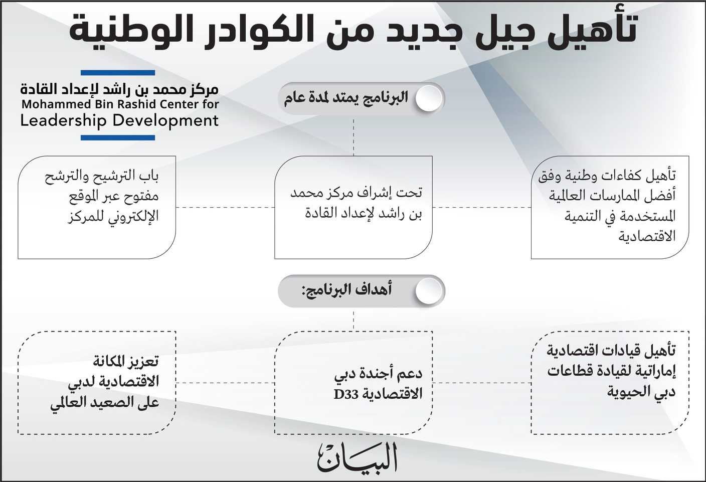 ويستهدف البرنامج، الذي ينظمه مركز محمد بن راشد لإعداد القادة، بالتعاون مع شركاء استراتيجيين عالميين في مجال الاقتصاد، إعداد كوادر وطنية عبر برامج نوعية وأنشطة هادفة، لإكسابهم مهارات حيوية تؤهلهم لقيادة المستقبل.