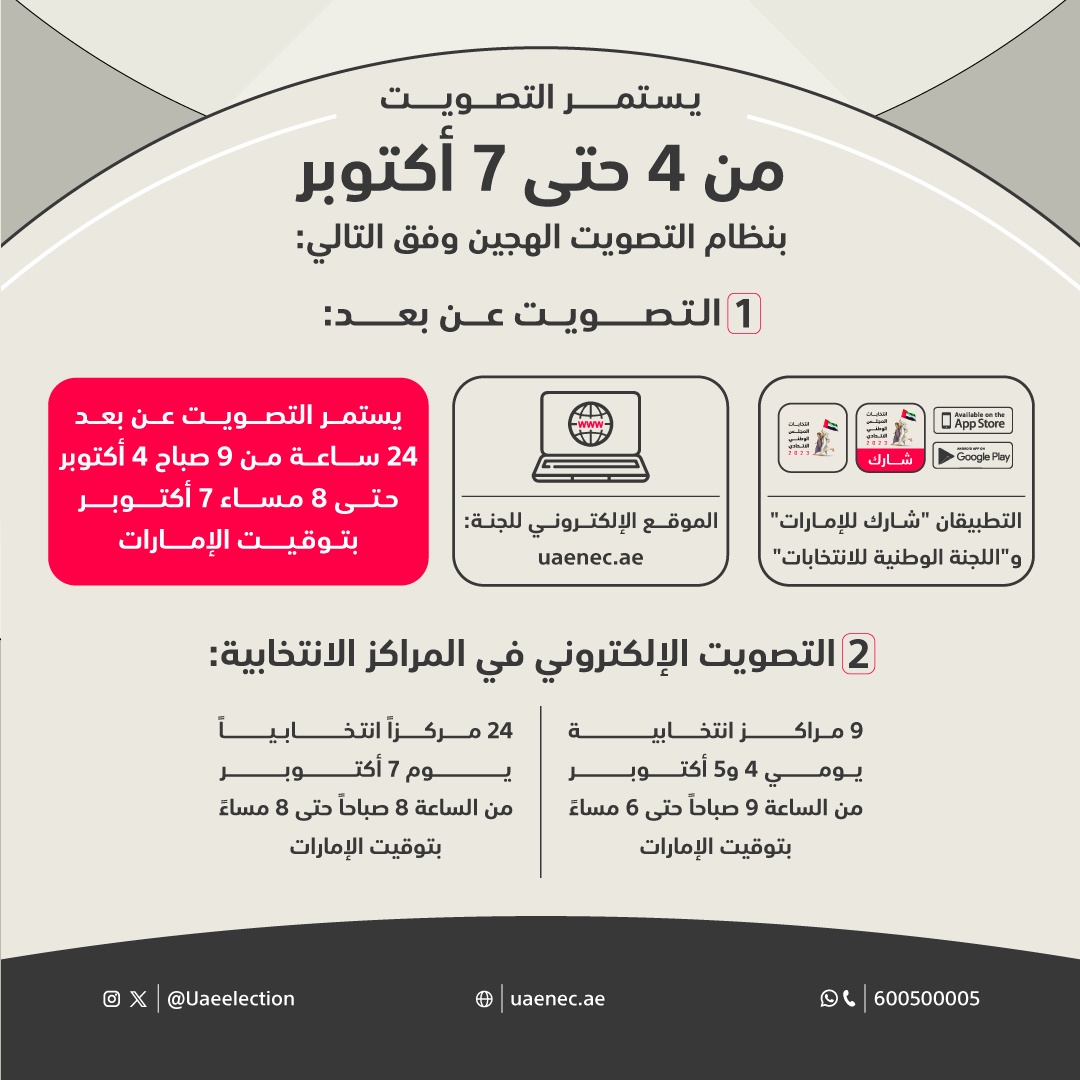 وسيكون التصويت عن بُعد متاحاً على مدار 24 ساعة ابتداء من الساعة التاسعة من صباح يوم الأربعاء 4 أكتوبر وحتى الساعة الثامنة من مساء يوم السبت 7 أكتوبر بتوقيت دولة الإمارات، في حين ستبدأ فترة التصويت المبكر في مراكز الانتخاب خلال يومي 4 و5 أكتوبر من الساعة (التاسعة) صباحاً حتى (السادسة) مساءً من كل يوم.