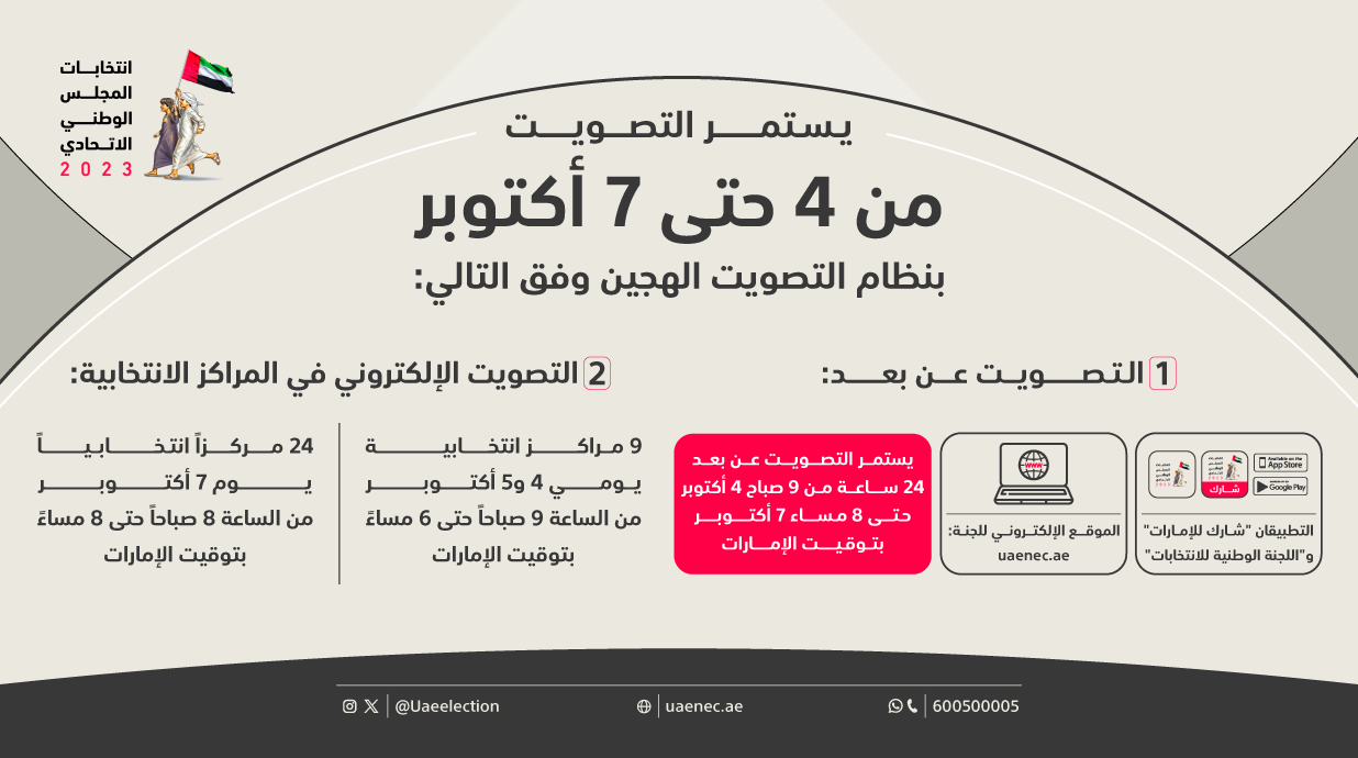 وتتوافر معلومات شاملة عن انتخابات المجلس الوطني الاتحادي 2023 عبر الموقع الإلكتروني للجنة الوطنية للانتخابات: www.uaenec.ae، وتطبيقها الذكي (اللجنة الوطنية للانتخابات- UAENEC) المتوفر على متجري آبل ستور وجوجل بلاي، وصفحات التواصل الاجتماعي الخاصة باللجنة، أو عبر خدمة الواتساب على الرقم (600500005).