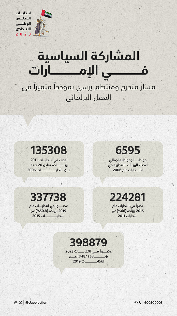 واستمراراً لتعزيز نهج وثقافة المشاركة السياسية في المجتمع، أعلنت اللجنة الوطنية للانتخابات، قوائم الهيئات الانتخابية لانتخابات المجلس الوطني الاتحادي 2023، بزيادة ملحوظة عن الانتخابات السابقة، حيث ضمت 398879 عضواً، بزيادة بنسبة تصل إلى 18.1% مقارنة مع قوائم الهيئات الانتخابية للعام 2019، والتي بلغ عدد أعضائها 337738 مواطناً ومواطنة.