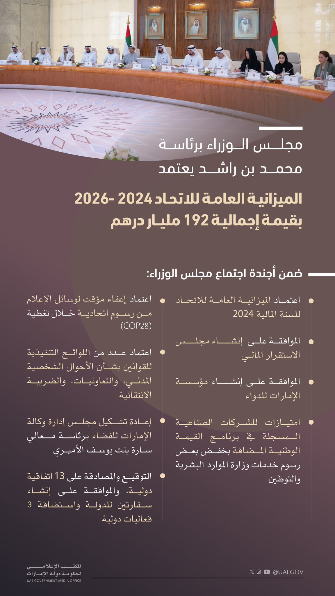 وقال صاحب السمو الشيخ محمد بن راشد آل مكتوم نائب رئيس الدولة رئيس مجلس الوزراء حاكم دبي "رعاه الله": "ترأست اليوم اجتماعاً لمجلس الوزراء بقصر الوطن بأبوظبي أقررنا خلاله الميزانية العامة للاتحاد 2024-2026 بقيمة إجمالية 192 مليار درهم تتوزع في عام 2024 على قطاع التنمية والمنافع الاجتماعية بنسبة 42٪ والشؤون الحكومية 39٪ والباقي موزع لتطوير البنية التحتية والأصول المالية والاقتصادية للحكومة الاتحادية".