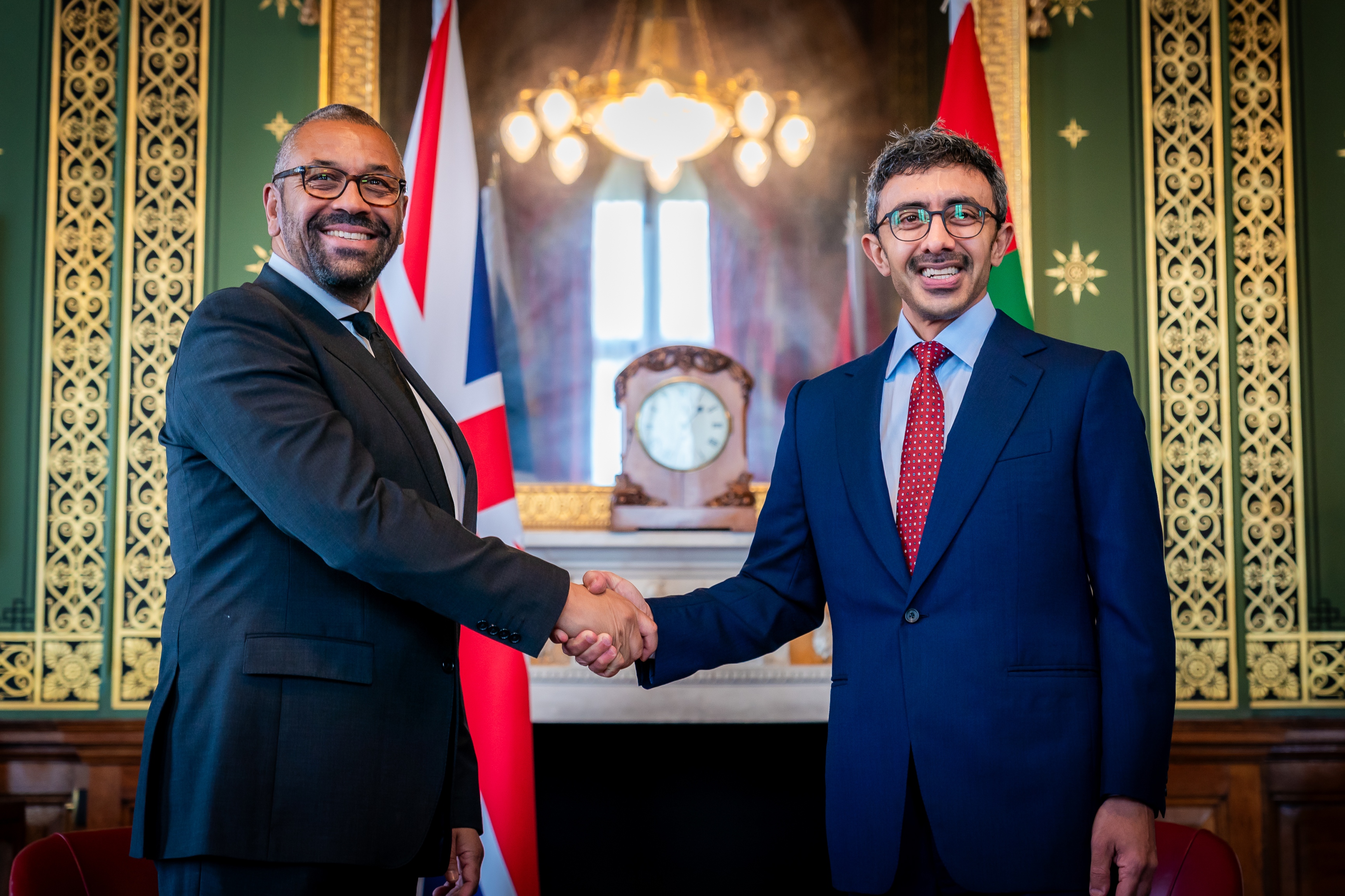 بحث سمو الشيخ عبدالله بن زايد آل نهيان وزير الخارجية خلال لقائه في لندن معالي جيمس كليفرلي، وزير الخارجية وشؤون الكومنولث والتنمية في المملكة المتحدة وإيرلندا الشمالية، مستجدات الأوضاع في المنطقة والتصعيد الجاري على الصعيد الإسرائيلي الفلسطيني.