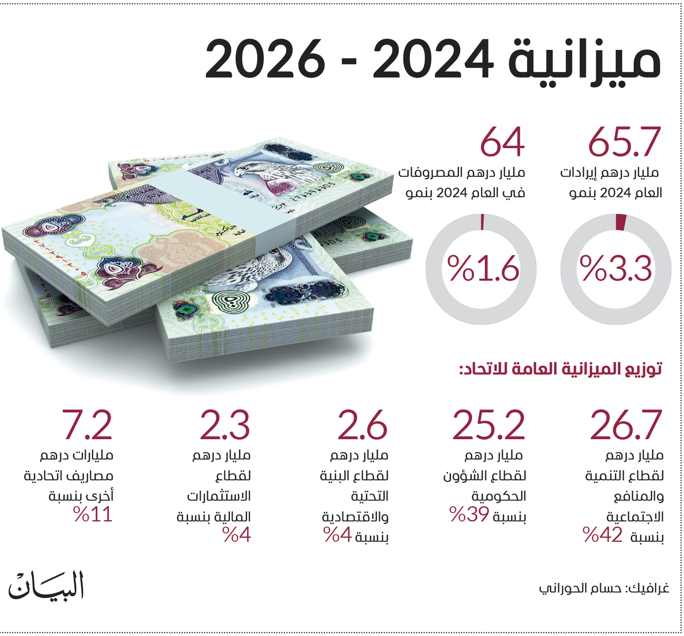 وقال صاحب السمو الشيخ محمد بن راشد آل مكتوم: «ترأست اجتماعاً لمجلس الوزراء بقصر الوطن بأبوظبي أقررنا خلاله الميزانية العامة للاتحاد 2024 - 2026 بقيمة إجمالية 192 مليار درهم تتوزع في عام 2024 على قطاع التنمية والمنافع الاجتماعية بنسبة 42 % والشؤون الحكومية 39 % والباقي موزع لتطوير البنية التحتية والأصول المالية والاقتصادية للحكومة الاتحادية».