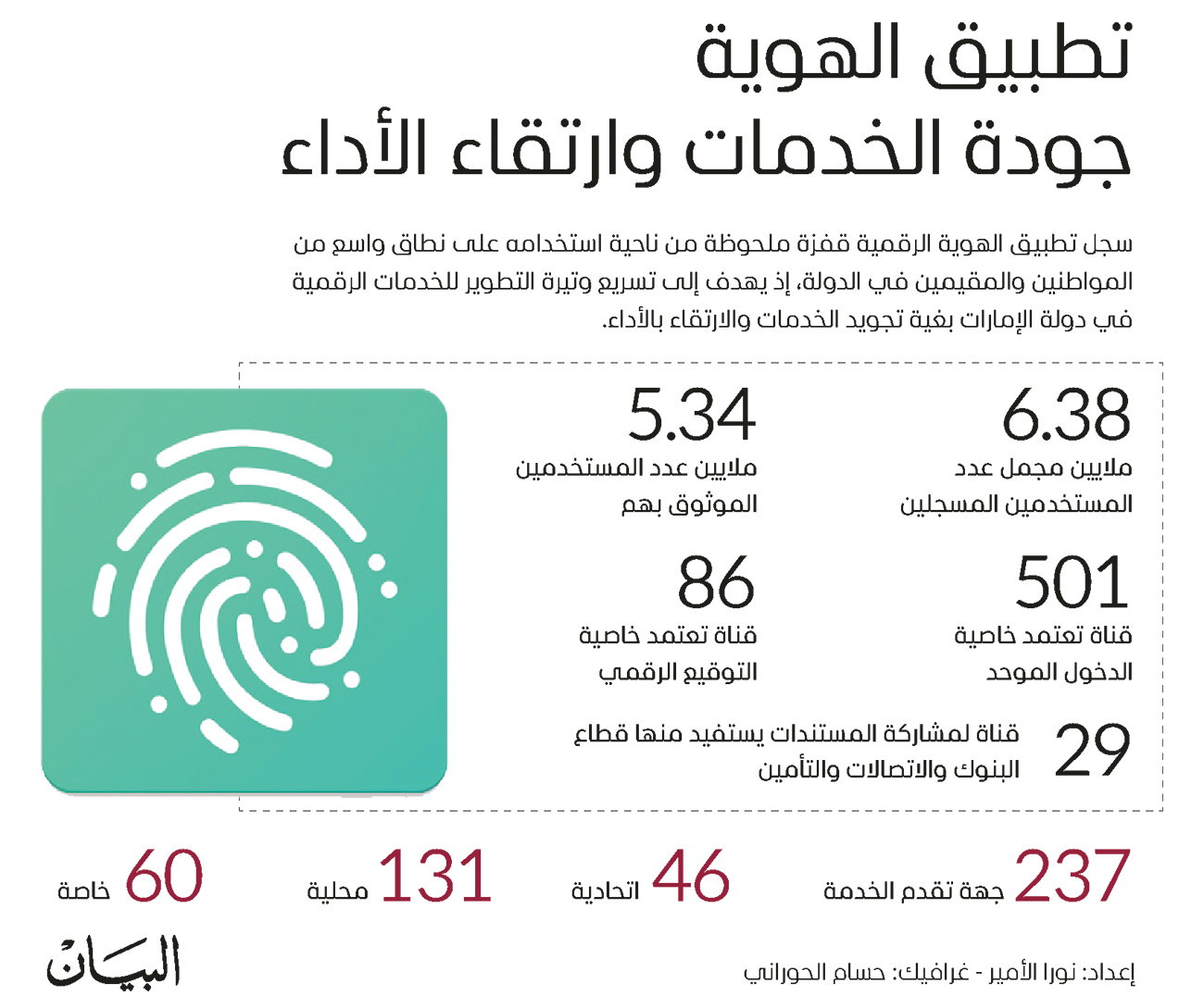 كشفت ميرة سلطان مدير إدارة منصات التمكين الرقمي في هيئة دبي الرقمية، عن تجاوز عدد الجهات التي تقدم خدماتها عبر تطبيق الهوية الرقمية حاجز الـ237 جهة حكومية، منها 46 اتحادية، و131 محلية و60 خاصة، وذكرت أن إجمالي عدد المستخدمين الموثوقين تخطى الـ5.34 ملايين، فيما بلغ عدد المسجلين 6.38 ملايين، معلنة عن أنهم بصدد إصدار تعميم على كل الجهات الحكومية في إمارة دبي لاعتماد الهوية الرقمية الآلية الموحدة للدخول وإجراء المعاملات.