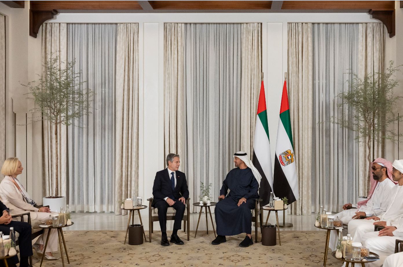 حضر اللقاء..سمو الشيخ خالد بن محمد بن زايد آل نهيان ولي عهد أبوظبي وسمو الشيخ طحنون بن زايد آل نهيان نائب حاكم إمارة أبوظبي وسمو الشيخ عبد الله بن زايد آل نهيان وزير الخارجية ومعالي الدكتور أنور بن محمد قرقاش المستشار الدبلوماسي لصاحب السمو رئيس الدولة ومعالي ريم بنت إبراهيم الهاشمي وزيرة دولة لشؤون التعاون الدولي ومعالي يوسف العتيبة سفير الدولة لدى الولايات المتحدة والوفد المرافق لوزير الخارجية الأميركي.