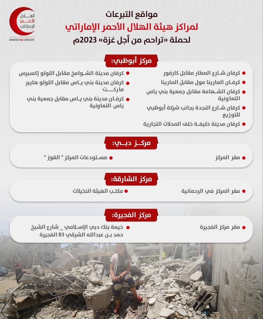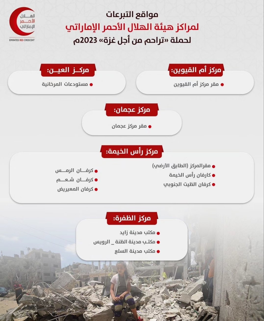 حددت هيئة الهلال الأحمر الإماراتي 26 مركزاً على مستوى الدولة لجمع التبرعات لحملة "تراحم من أجل غزة" الخاصة بإغاثة الأشقاء الفلسطينيين المتأثرين من الحرب في قطاع غزة، وذلك في إطار الجهود الإنسانية التي تقوم بها دولة الإمارات لتقديم المساعدات العاجلة للشعب الفلسطيني.