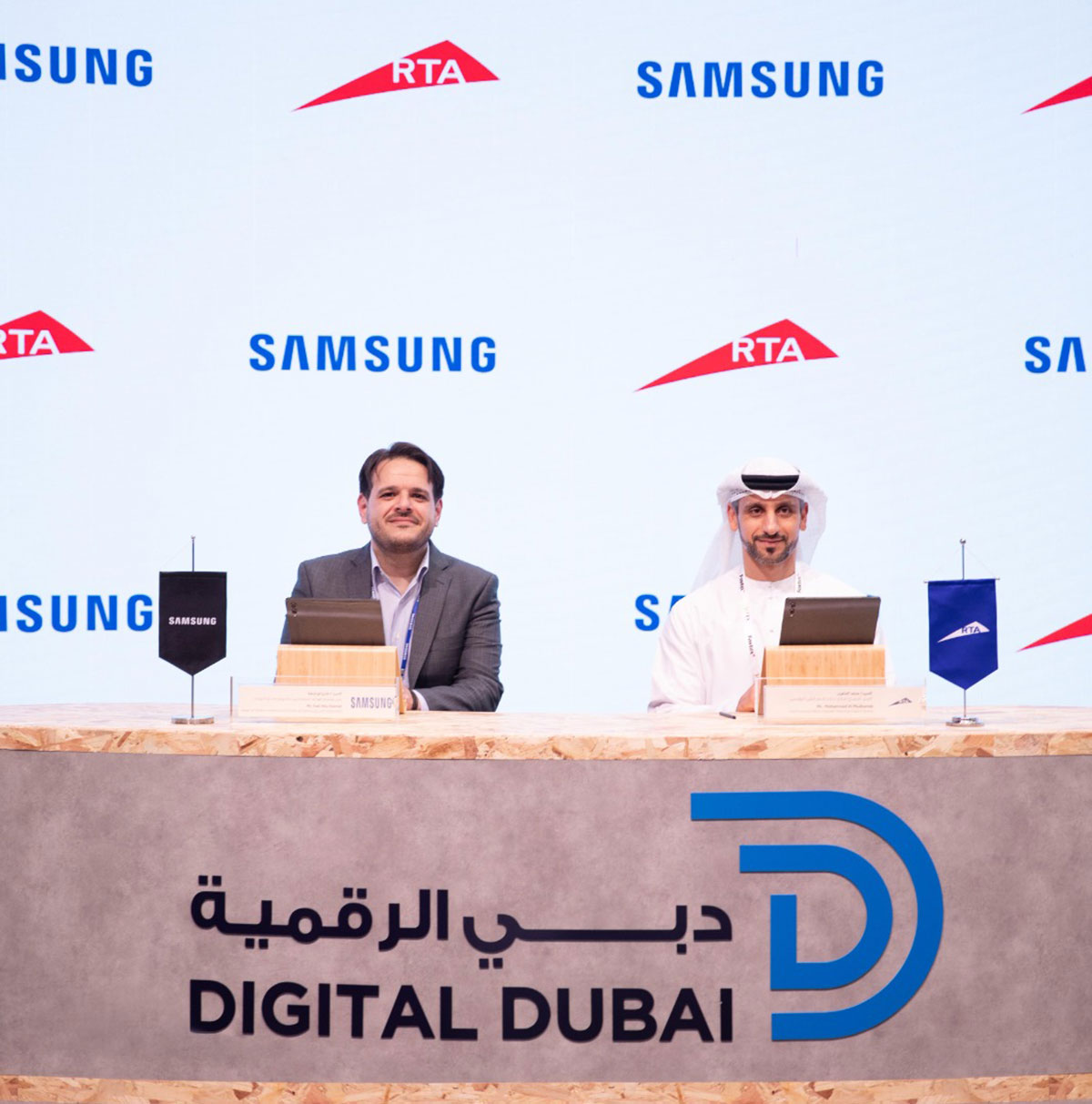 وقّع الاتفاقية عن هيئة الطرق والمواصلات محمد المظرّب، المدير التنفيذي لقطاع خدمات الدعم التقني في الهيئة، ووقعها عن شركة سامسونج جلف للإلكترونيات، فادي أبو شمط، رئيس مجموعة الهواتف المحمولة في سامسونج في دول الخليج العربي.