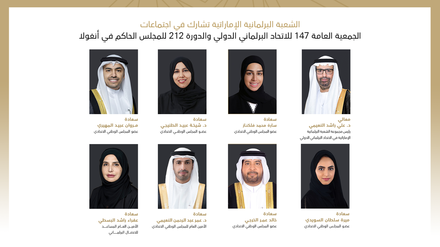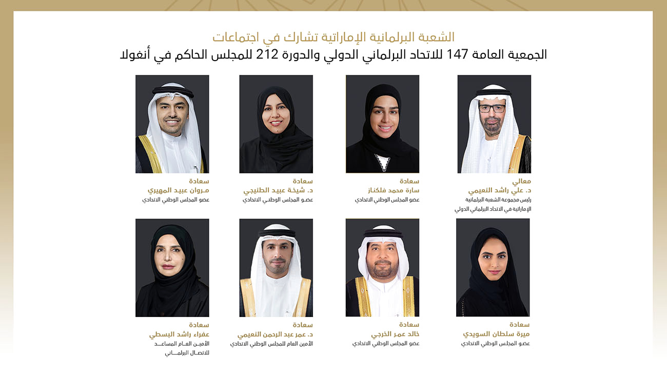 تشارك مجموعة الشعبة البرلمانية للمجلس الوطني الاتحادي في الاتحاد البرلماني الدولي، برئاسة الدكتور علي راشد النعيمي رئيس المجموعة، في اجتماعات الجمعية العامة 147 للاتحاد البرلماني الدولي والدورة 212 للمجلس الحاكم، وذلك في أنغولا بالعاصمة لواندا خلال الفترة من 23 إلى 27 أكتوبر الحالي.