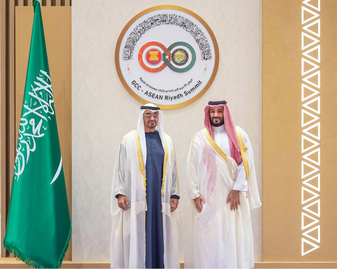 ترأس صاحب السمو الشيخ محمد بن زايد آل نهيان رئيس الدولة “حفظه الله” اليوم وفد دولة الإمارات المشارك في "قمة الرياض" بين مجلس التعاون لدول الخليج العربية ورابطة دول جنوب شرق آسيا "الآسيان" التي افتتحها صاحب السمو الملكي الأمير محمد بن سلمان بن عبد العزيز آل سعود ولي العهد رئيس مجلس الوزراء في المملكة العربية السعودية الشقيقة.