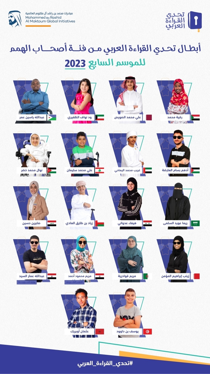 يترقب العالم العربي غداً الثلاثاء، لمعرفة بطل تحدي القراءة العربي في دورته السابعة لفئة أصحاب الهمم، وهي الفئة التي أضيفت في الدورة السابعة للتحدي، للمرة الأولى، ما يعكس حرص المبادرة على الاهتمام بأصحاب الهمم، وإتاحة الفرصة أمامهم لإثبات جدارتهم وتفوقهم، حيث شارك 22506 طلاب وطالبات في التصفيات على مستوى الدول، واشترطت لجنة التحكيم لفئة أصحاب الهمم، قراءة إجمالي 25 كتاباً.