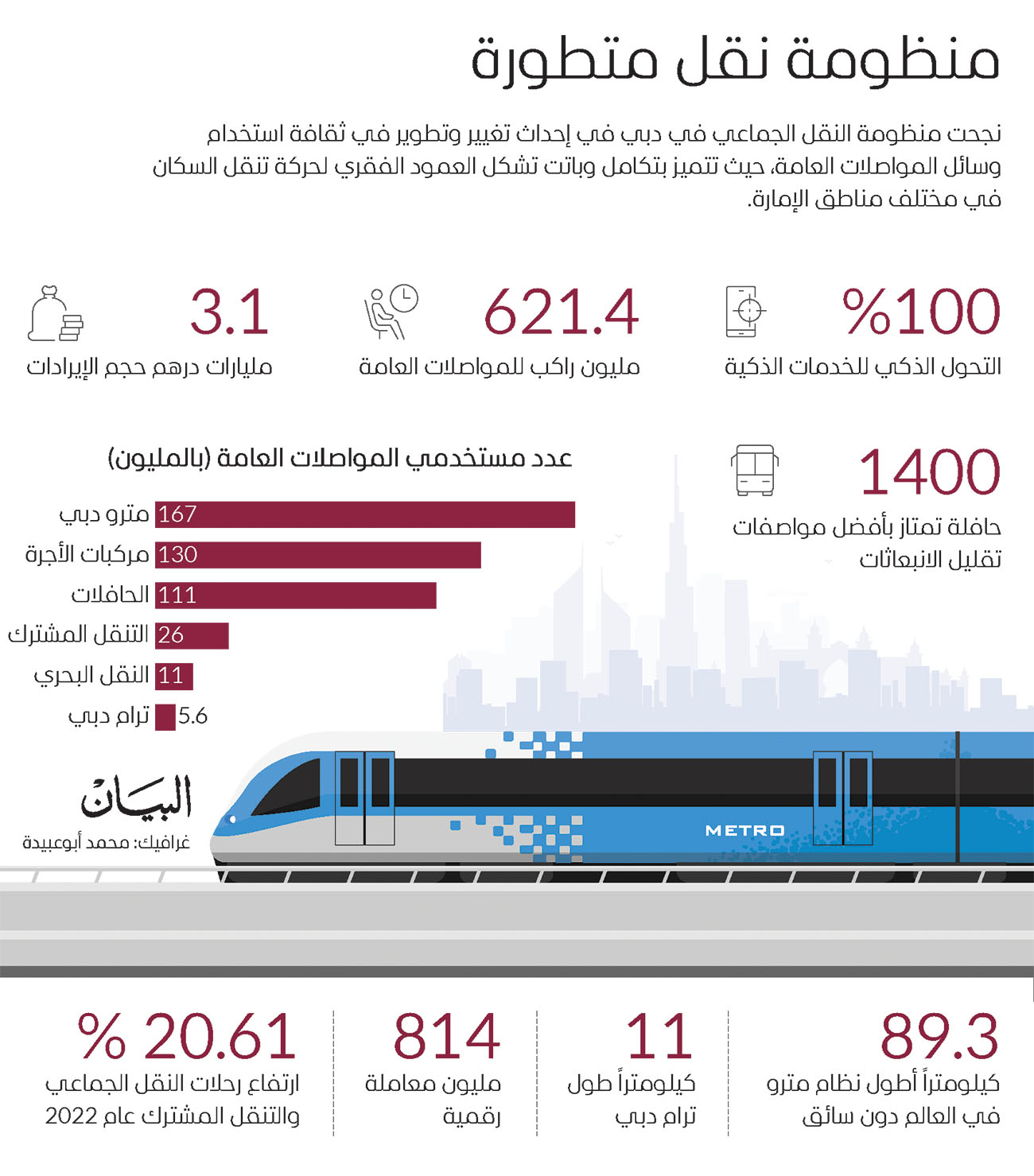 وقال معاليه: نجحت مبادرة يوم المواصلات العامة في تعزيز دور إمارة دبي في دعم الجهود التي تسهم في تحسين البيئة، وتحقيق التنمية المستدامة، وتشجيع السكان على التحول نحو استخدام وسائل النقل الجماعي، ورفع نسبة مستخدميها، حيث بلغ عدد ركاب مترو دبي وترام دبي وحافلات المواصلات العامة، ووسائل النقل البحري، ومركبات الأجرة، والتنقل المشترك: (مركبات الحجز الإلكتروني ومركبات التأجير الذكي، والحافلات تحت الطلب) عام 2022، قرابة 621.4 مليون راكب، بمعدل مليون و700 ألف راكب يومياً، بينما بلغ عدد الركاب خلال الأشهر الثمانية الأولى من العام الجاري، قرابة 450 مليون راكب، مقارنة بنحو 401 مليون راكب، خلال الفترة نفسها من العام الماضي (2022)، بزيادة قدرها 12%، واستحوذ مترو دبي على النسبة الكبرى من مستخدمي وسائل النقل الجماعي، بواقع 167 مليون راكب، تليه مركبات الأجرة (تاكسي دبي وشركات الامتياز)، بقرابة 130 مليون راكب، بينما بلغ عدد مستخدمي حافلات المواصلات العامة قرابة 111 مليون راكب، وبلغ عدد مستخدمي وسائل النقل البحري 11 مليون راكب، ونقل ترام دبي خمسة ملايين و600 ألف راكب، أما وسائل التنقل المشترك (مركبات الحجز الإلكتروني، والتأجير الذكي، والحافلات تحت الطلب)، فقد نقلت قرابة 26 مليون راكب.