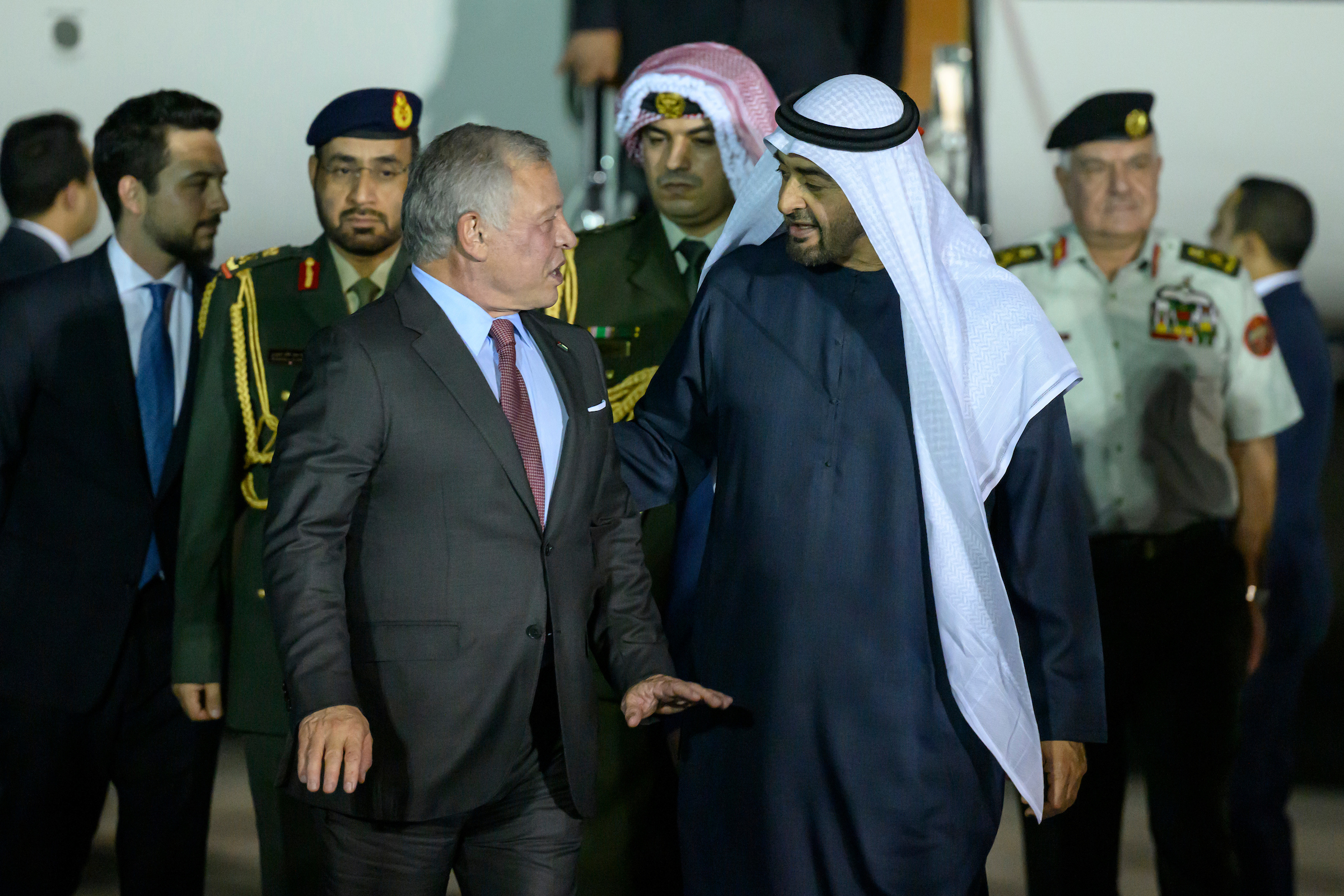 وكان صاحب السمو الشيخ محمد بن زايد آل نهيان رئيس الدولة "حفظه الله" في مقدمة مستقبلي أخيه صاحب الجلالة الملك عبدالله الثاني لدى وصوله والوفد المرافق مطار البطين في أبوظبي.