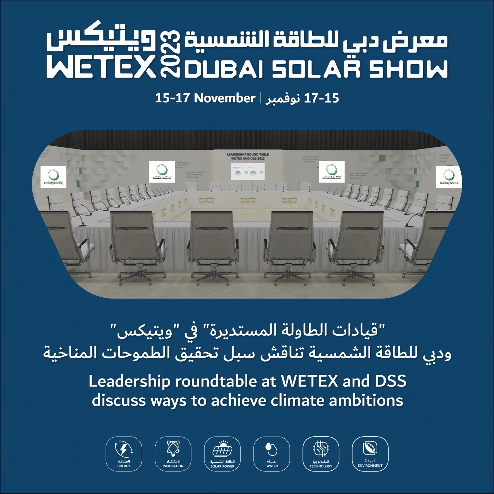 وتسلط فعالية "قيادات الطاولة المستديرة" خلال المعرض الضوء على التحديات والفرص في مجال الاستدامة، ودور القيادات في اتخاذ الإجراءات اللازمة لمواجهة التحديات المناخية وتحفيز النمو خلال العقد القادم. كما تركز "قيادات الطاولة المستديرة" على سبل توطيد أواصر التعاون والعمل المشترك لتحقيق أهداف التنمية المستدامة للأمم المتحدة 2030، ومناقشة السياسات والتشريعات والتطورات التي يشهدها الاقتصاد الأخضر والاقتصاد الدائري في المنطقة، إلى جانب تحليل ومناقشة الاستراتيجيات المتعلقة بمختلف موضوعات الاستدامة مثل التنقل الأخضر وتمويل العمل المناخي، والتطبيق الفعال لإدارة الطلب على الطاقة، والزراعة المستدامة، وانتقال الطاقة، وغيرها من الميادين الحيوية التي تدعم تحقيق الحياد الكربوني عالمياً.